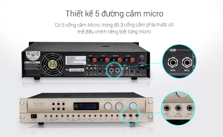 - Có 5 cổng cắm Micro, trong đó 3 cổng cắm phía trước có thể điều chỉnh riêng biệt từng micro, thích hợp nhu cầu nhiều người sử dụng và không gian rộng rãi của phòng hát karoake chuyên nghiệp.