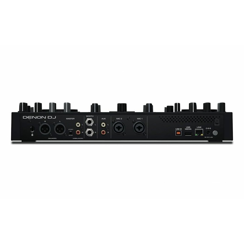Mặt sau của thiết bị được thiết kế với các cổng kết nối âm thanh và nguồn điện. Thiết bị có 4 cổng Master Out (2 Balanced và 2 Unbalanced), 2 cổng Booth Out, 2 cổng vào Micro và AUX, đáp ứng được các nhu cầu kết nối âm thanh khác nhau của người dùng.