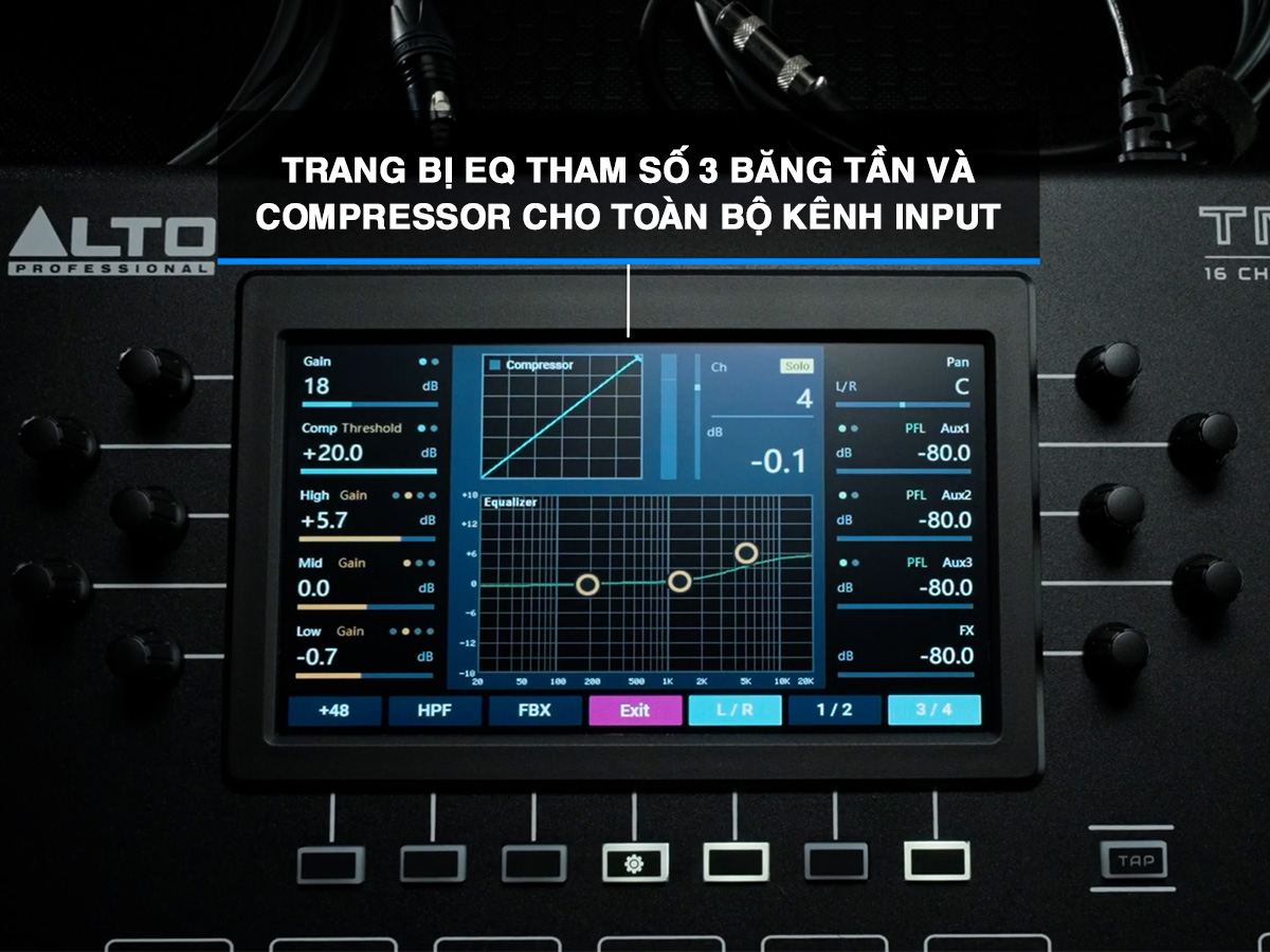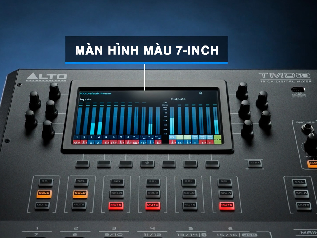 Một trong những điểm nổi bật nhất của Alto TMD16 là màn hình màu 7 inch, cho khả năng hiển thị thông tin rõ ràng, sinh động. Màn hình này giúp người dùng theo dõi trực tiếp với các thông số kỹ thuật, điều chỉnh EQ, hiệu ứng, fader… mà không cần "đào sâu" vào menu phức tạp như nhiều mixer kỹ thuật số khác.