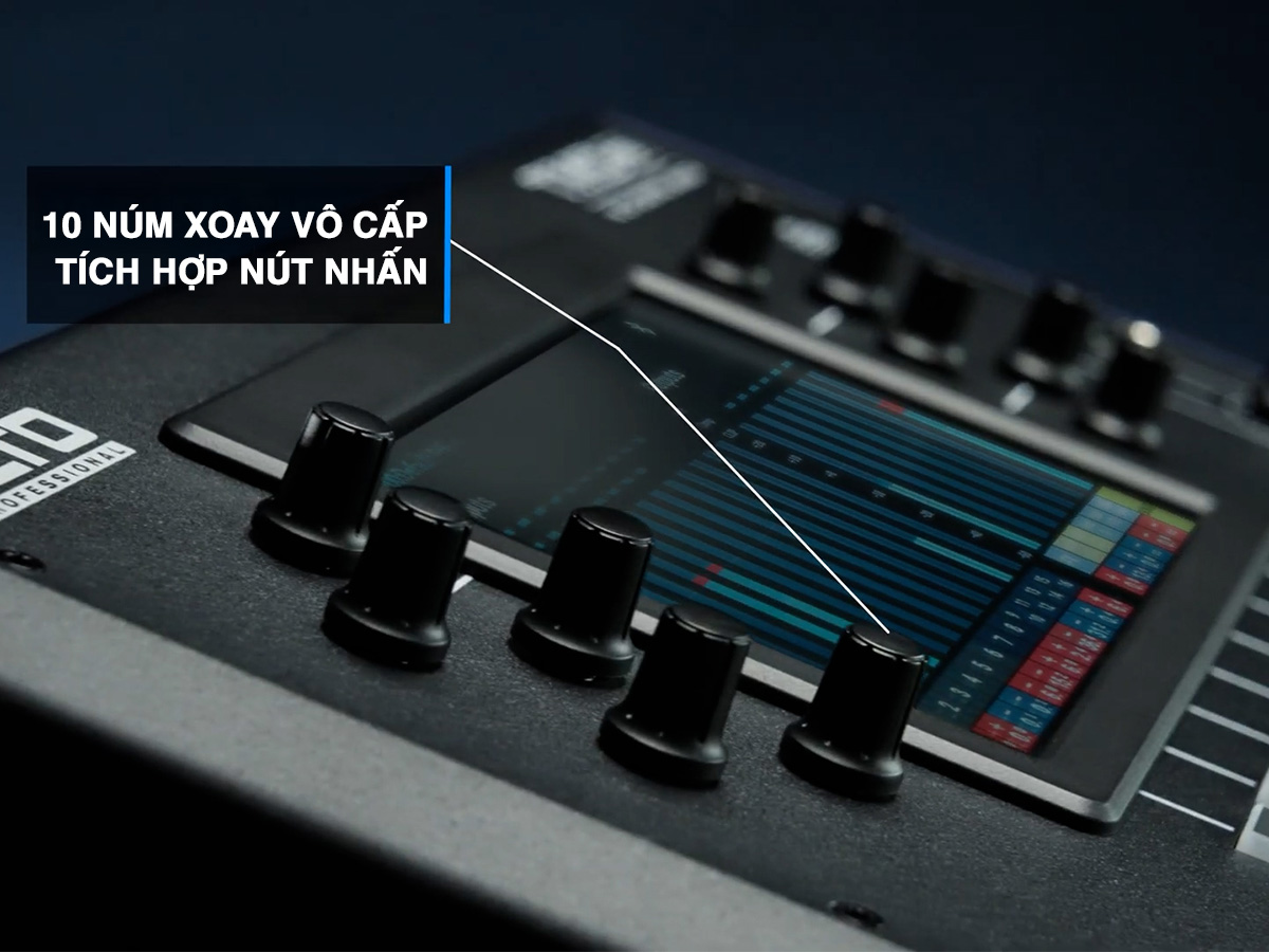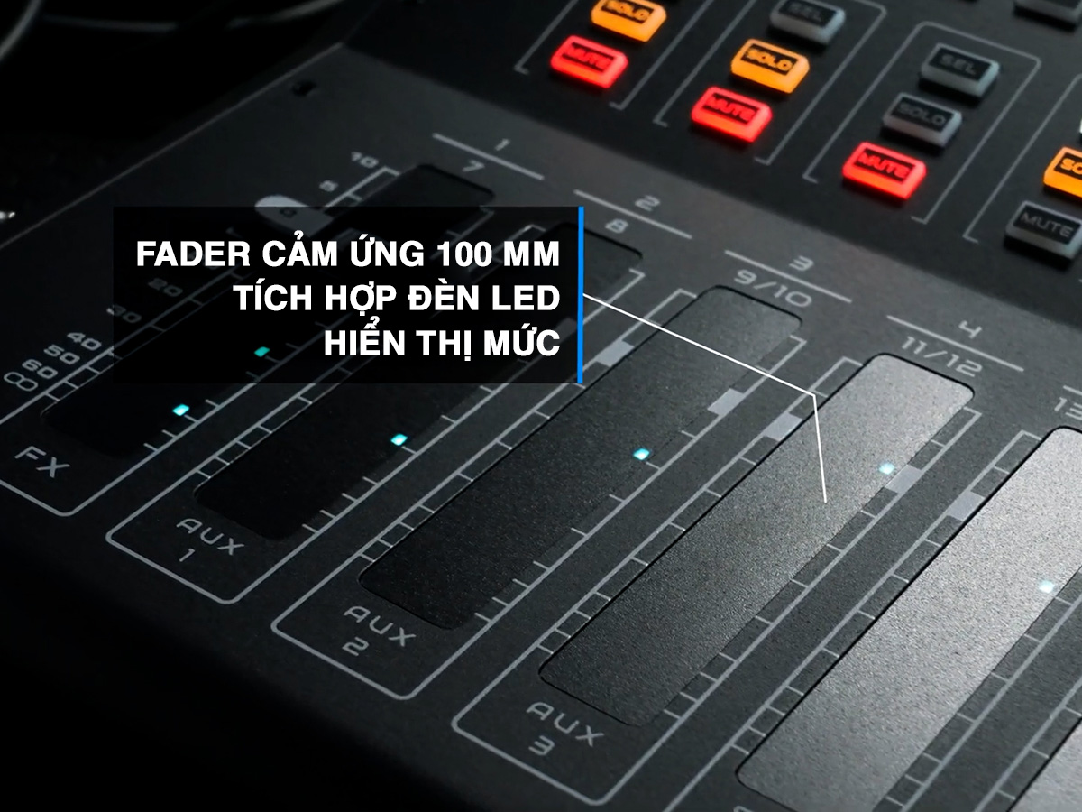 Bên cạnh đó, mixer còn được trang bị 10 núm điều khiển có chức năng nhấn, 7 nút điều khiển có đèn nền, cùng 7 fader cảm ứng điện dung đi kèm hệ thống LED 18 đoạn hiển thị mức tín hiệu chi tiết. Tất cả mang lại trải nghiệm điều khiển âm thanh hiện đại, chính xác và thân thiện với người dùng.