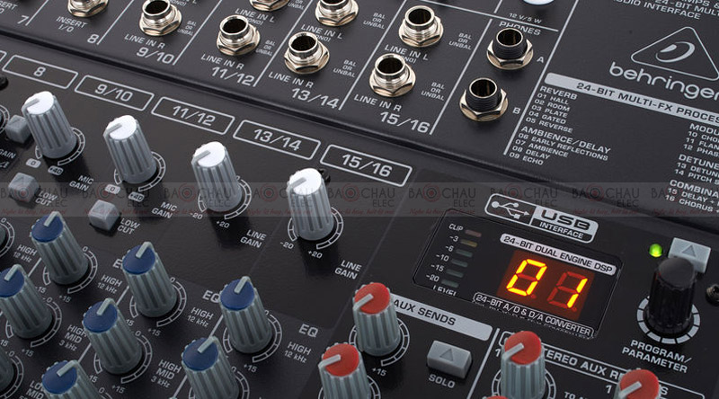 XENYX X2442USB còn sở hữu bộ xử lý hiệu ứng đôi (dual-engine) 24-bit cao cấp với 16 hiệu ứng chuyên nghiệp có thể tùy chỉnh như reverb, chorus, flanger, delay, pitch shift và nhiều hiệu ứng kết hợp khác – biến chiếc mixer này trở thành công cụ cực kỳ linh hoạt cho các buổi biểu diễn trực tiếp.