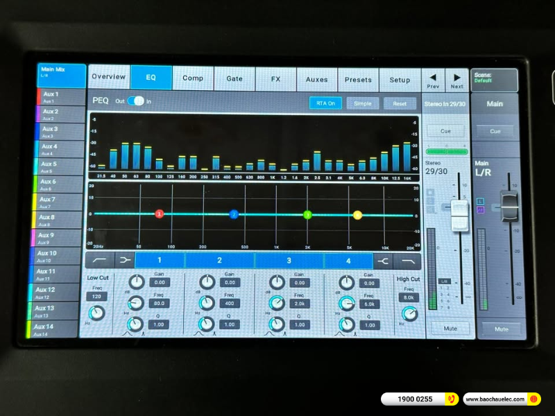 Mỗi kênh đầu vào trên QSC TouchMix-30 Pro được tích hợp EQ tham số 4 băng (4-band Parametric EQ), bộ lọc cắt tần cao thấp (HPF/LPF), cùng Compressor và Gate giúp kiểm soát âm thanh chi tiết. Ngoài ra, mixer còn hỗ trợ Delay điều chỉnh lên đến 100ms cho từng kênh. Ở đầu ra, thiết bị cung cấp EQ đồ họa 1/3 octave, EQ tham số 6 băng, Compressor/Limiter và bộ chống hú 12 băng, đảm bảo âm thanh cân bằng, rõ nét, không méo và dễ kiểm soát trong mọi không gian.