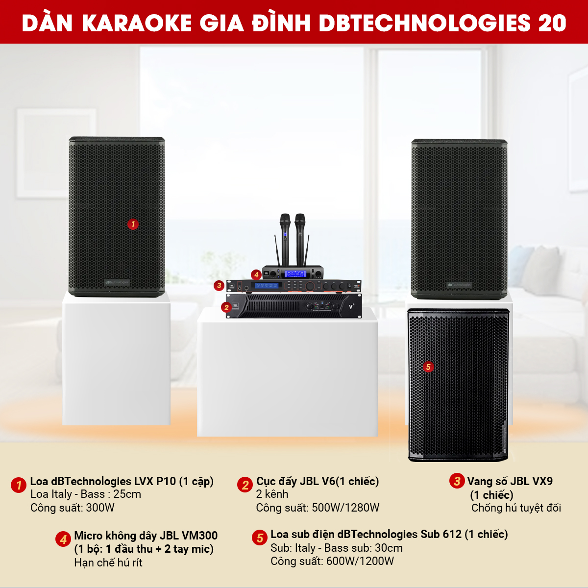 Dàn karaoke dBTechnologies 20 là lựa chọn hiện đại, chuyên nghiệp cho gia đình muốn trải nghiệm karaoke và nghe nhạc chất lượng cao. Bộ dàn kết hợp giữa loa passive, sub điện và amply mạnh mẽ, phù hợp không gian gia đình trung bình.