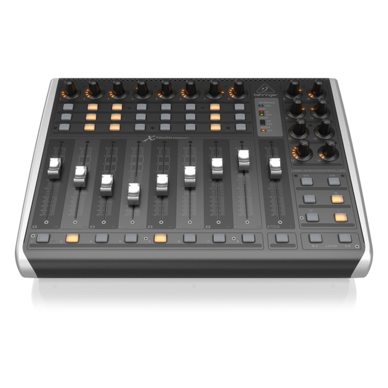 - 9 cần gạt có động cơ 100 mm hoàn toàn tự động và cảm ứng, Behringer X-Touch Compact cho phép bạn thay đổi giữa chế độ hai lớp để dễ dàng chuyển đổi giữa DAW và thiết bị điều khiển.