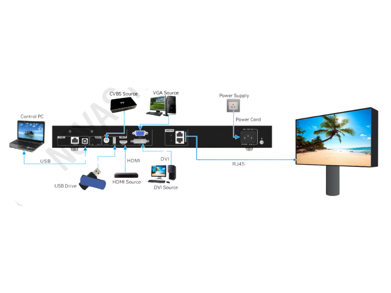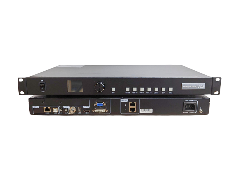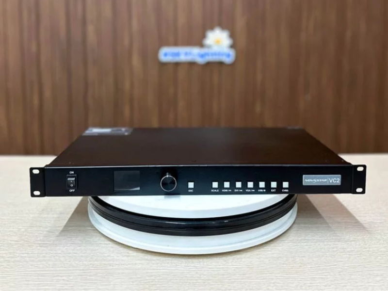Để tối ưu khả năng trình chiếu, hệ thống sử dụng bộ xử lý hình ảnh Novastar VC2, cho phép kết nối linh hoạt với nhiều nguồn tín hiệu nhờ 5 cổng đầu vào gồm DVI, HDMI 1.3, VGA, USB và CVBS.