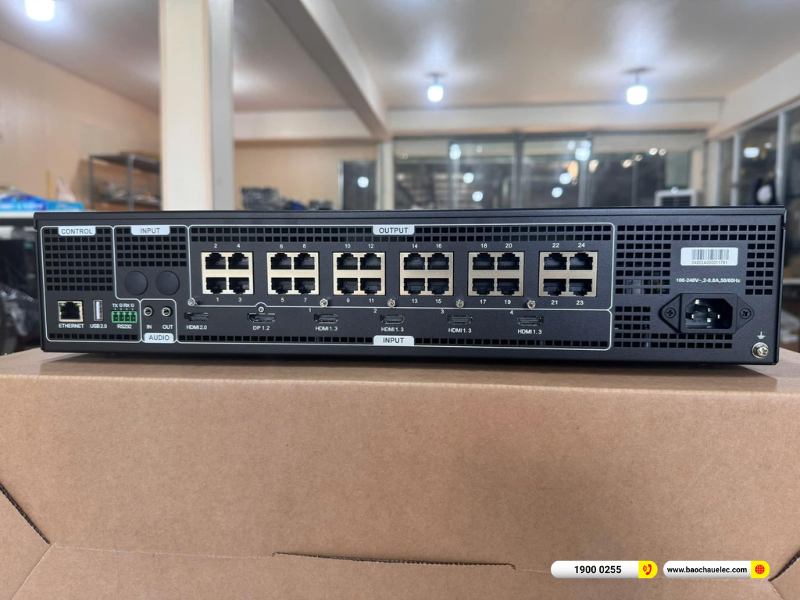 Ở đầu ra, thiết bị sở hữu 24 cổng Ethernet RJ45, đảm bảo truyền tín hiệu ổn định cho các hệ thống màn hình LED lớn mà không cần mở rộng thêm bộ phát ngoài. Ngoài ra, VC24 còn hỗ trợ cổng HDMI giám sát và cổng Audio, thuận tiện cho việc theo dõi và đồng bộ âm thanh.