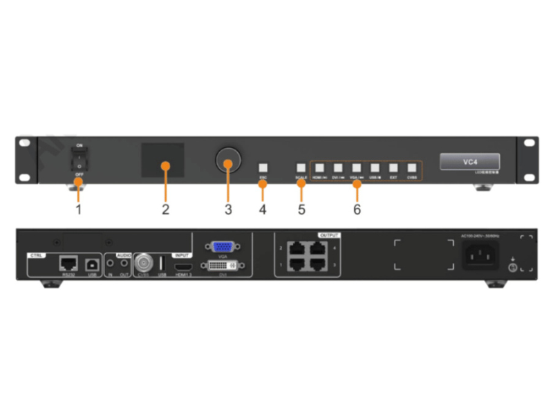 Bộ xử lý hình ảnh Novastar VC4 được trang bị 5 cổng kết nối đầu vào phổ biến và thông dụng, bao gồm: 1 x DVI, 1 x HDMI 1.3, 1 x VGA, 1 x USB và 1 x CVBS. Hệ thống cổng đầu vào đa dạng này cho phép thiết bị dễ dàng tiếp nhận tín hiệu từ nhiều nguồn phát khác nhau trong cùng một hệ thống.