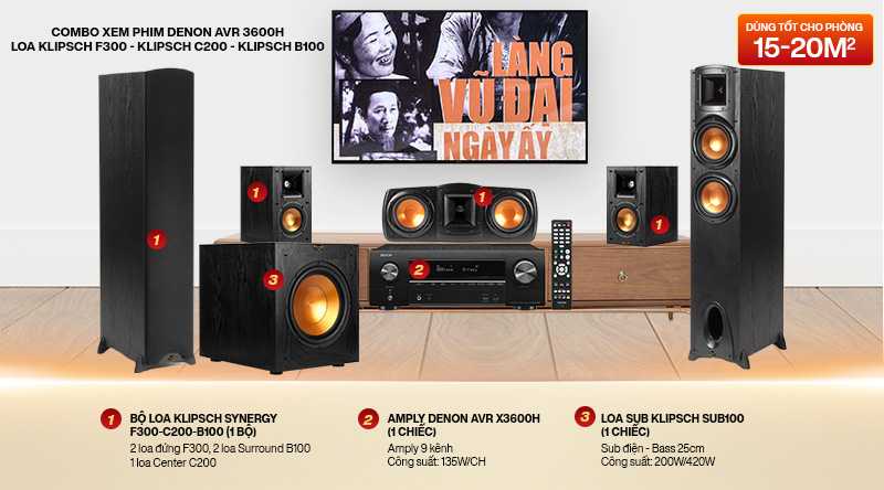 Được đội ngũ kỹ thuật viên phối ghép từ những thiết bị âm thanh chính hãng phù hợp về cấu hình và thông số kỹ thuật. Combo xem phim Denon AVR 3600H - Loa Klipsch F300 - Klipsch C200 - Klipsch B101 đã đáp ứng hoàn toàn mọi tiêu chuẩn về chất lượng âm thanh, hình ảnh sắc nét mang lại cho người dùng trải nghiệm xem phim, nghe nhạc ấn tượng nhất ngay tại không gian giải trí tại gia.