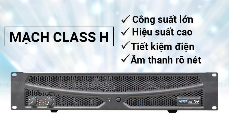 Cục đẩy công suất APP MZ-106 được trang bị mạch công suất ClassH giúp cho thiết bị hoạt động ít bị nóng hơn kể cả trong nhiều giờ liền, mang lại một hiệu suất hoạt động đáng kinh ngạc, đặc biệt là cho ra mức công suất mạnh mẽ, lượng công suất hao phí giảm đi rất nhiều so với mạch AB. Âm thanh rõ ràng, không bị méo, rè hay vỡ tiếng.