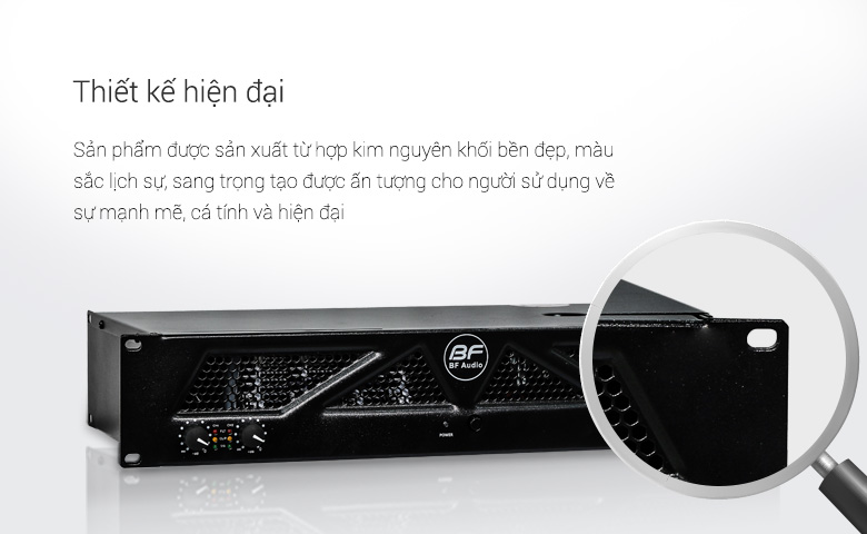 Những dòng cục đẩy công suất đến từ thương hiệu Bfaudio có thiết kế tương tự nhau. Sản phẩm được sản xuất từ hợp kim nguyên khối bền đẹp, màu sắc lịch sự, sang trọng tạo được ấn tượng cho người sử dụng về sự mạnh mẽ, cá tính và hiện đại. Tên sản phẩm và logo thương hiệu ngay trên mặt trước của sản phẩm. Các nút chỉnh âm lượng 2 kênh khá là chắc và điều chỉnh chính xác dễ dàng hơn. Các chỉ số báo trên đèn LED chính xác cho mỗi kênh hiển thị.