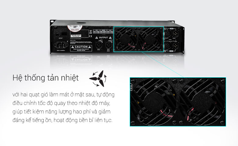 Mặt sau của sản phẩm được giới thiệu các thông số của thiết bị, là cổng kết nối vào/ ra riêng biệt của 2 kênh, 2 đầu ra loa, đầu vào nguổn điện và chọn chế độ Stereo/ Bridged/Parallel. Tất cả các ngõ vào và ra được sử dụng Jack kết nối chuyên nghiệp giúp cho việc kết nối thiết bị trở nên đơn giản hơn.