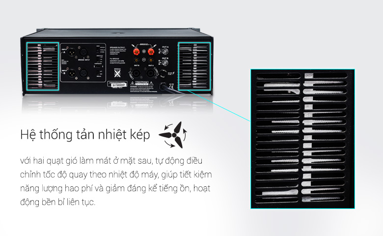 Mặt trước gồm 1 công tắc nguồn, 2 núm điều chỉnh cùng 2 dày đèn led thể hiện trạng thái hoạt động cho 2 kênh riêng biệt. Bên cạnh đó là các rãnh tản nhiệt được trải đều giúp cục đẩy có thể hoạt động liên tục mà ít bị nóng.