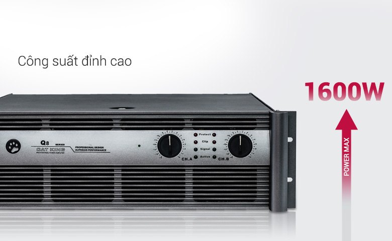 Sở hữu mức công suất 800W/ CH (8Ω Stereo), 1600W/ CH (4Ω Stereo), 3000W/ CH (2Ω Stereo), 1500W (8Ω Bridge) và 3000W (4ΩBridge) nên cục đẩy Cat King Q8 có khả năng kéo được những cặp loa có cục công suất khủng với chất âm mạnh mẽ, uy lực.