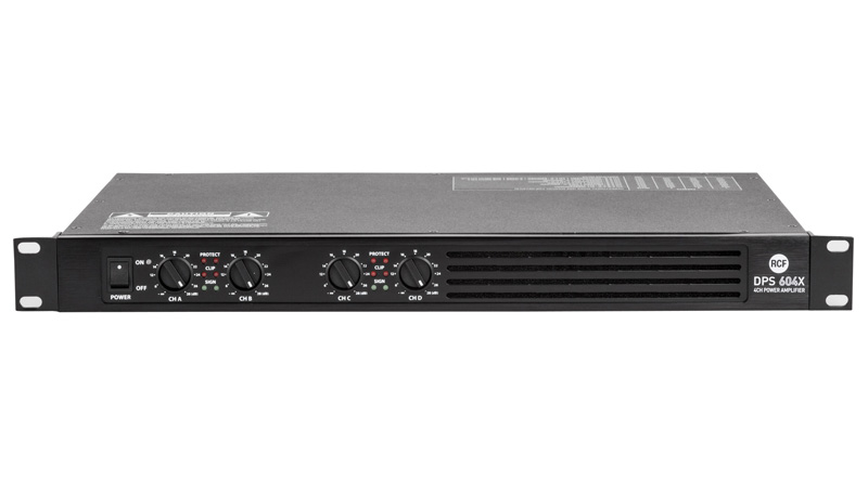 RCF DPS 604X có mặt trước thiết kế khá đơn giản bao gồm các núm điều chỉnh 4 kênh và nút nguồn được sắp xếp hợp lý giúp người dùng dễ dàng sử dụng. Bên cạnh đó là hệ thống tản nhiệt nhỏ xinh có cả ở mặt trước và mặt sau hoạt động rất tốt.