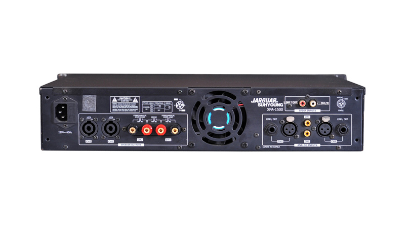 Mặt sau cục đẩy Jarguar Suhyoung XPA1500 là 4 ngõ ra loa, trong đó có 2 jack Speakon và 2 jack tiêu chuẩn đỏ - đen nên quý khách hàng có thể tùy ý lựa chọn kiểu kết nối phù hợp. Bên cạnh đó còn có 1 ngõ đồng trục vào, 1 ngõ ra, 2 jack Canon in, 2 jack AV in và 2 jack 6 li out.