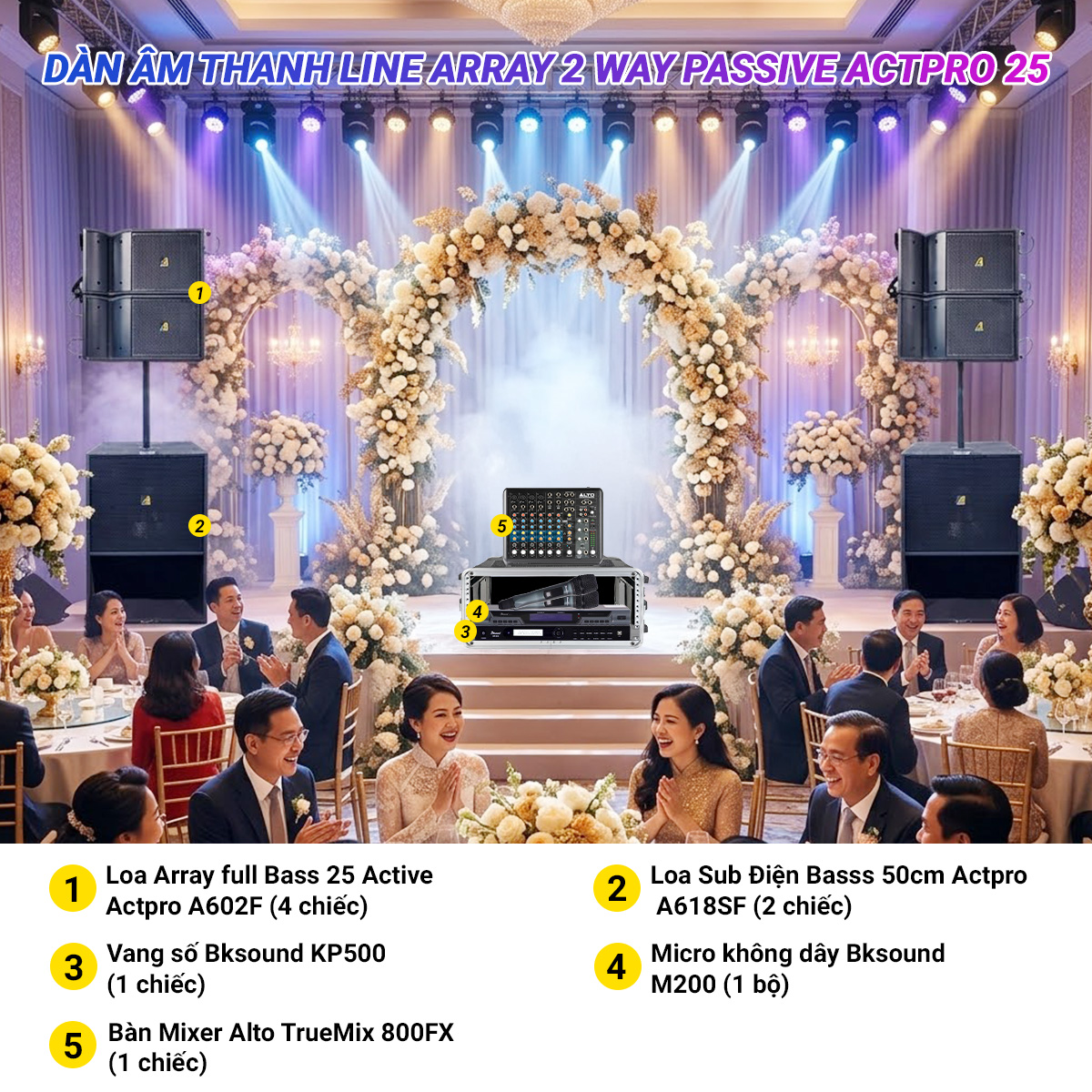Dàn âm thanh Line Array Active Actpro 25 là hệ thống âm thanh chuyên nghiệp được thiết kế để phục vụ cho các không gian lớn như tiệc cưới, sân khấu ngoài trời, hội trường, triển lãm… với quy mô lên đến 300 người. Hệ thống không chỉ đảm bảo âm thanh mạnh mẽ mà còn dễ dàng kiểm soát, xử lý tiếng hát mượt mà, ổn định và chống hú hiệu quả. Đây là giải pháp âm thanh toàn diện, lý tưởng cho mọi nhu cầu sự kiện, sân khấu hoặc kinh doanh dịch vụ âm thanh.