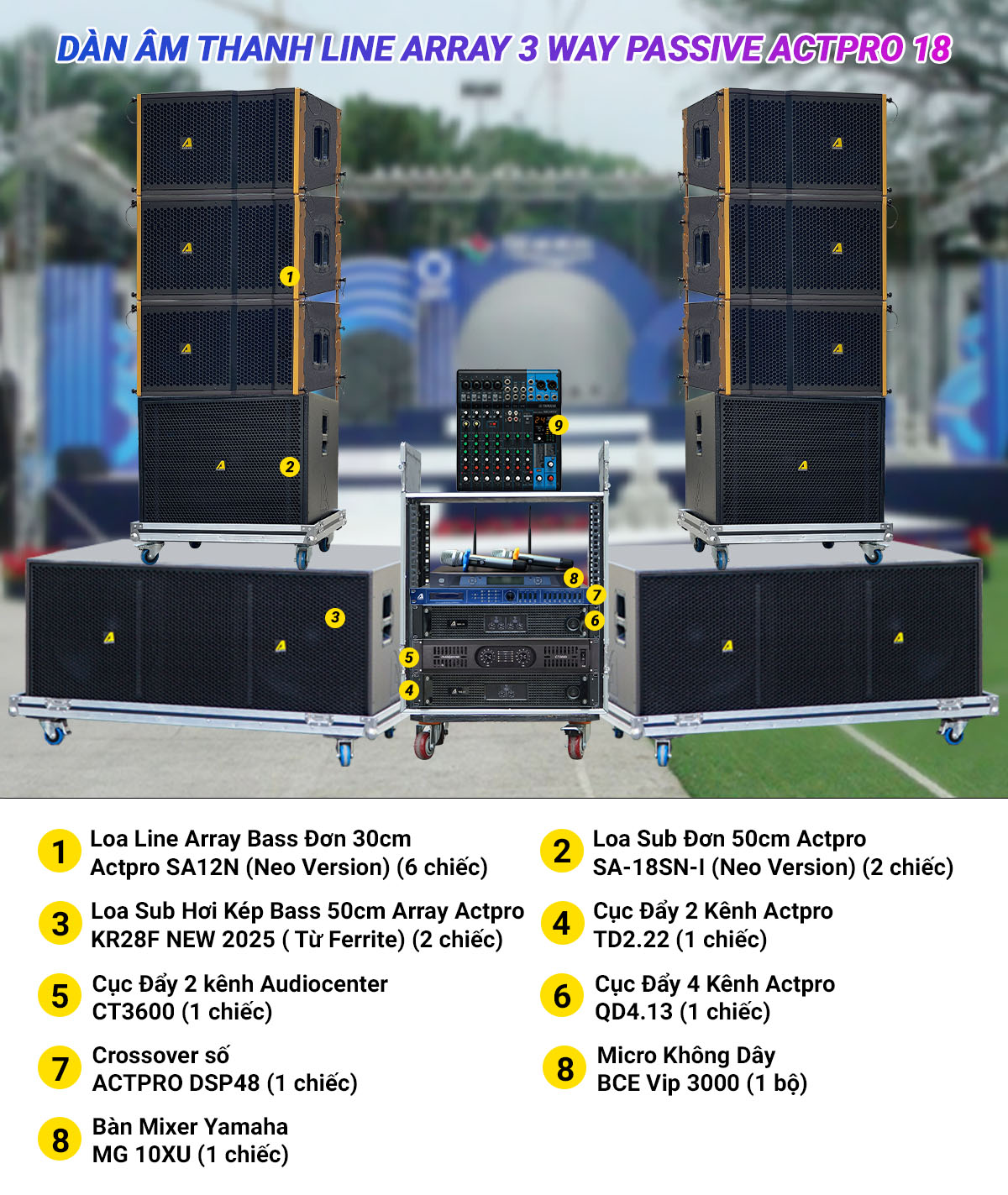 Dàn Âm Thanh Line Array 3 Way Passive Actpro 18 là một hệ thống âm thanh mạnh mẽ và chất lượng cao được thiết kế đặc biệt để mang lại trải nghiệm âm nhạc sống động cho các sự kiện và không gian lớn. Hệ thống bao gồm các thiết bị Actpro, King Housse, Yamaha,… tạo nên dải tần số rộng, độ nhạy cao và công suất ấn tượng, đảm bảo âm thanh rõ ràng và mạnh mẽ trong mọi tình huống.