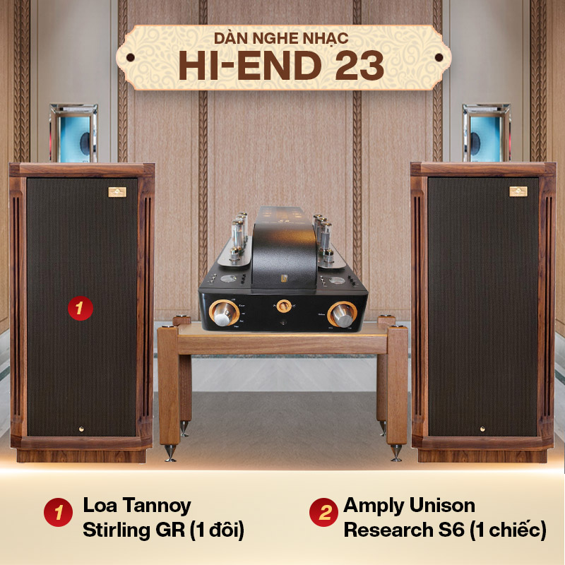 Bạn thử tưởng tượng dàn âm thanh được phối ghép từ các thiết bị cao cấp loa Tannoy Stirling GR và Amply Unison Research S6 cao cấp thì sẽ tuyệt vời như nào. Dàn nghe nhạc hi-end 23 sẽ mang đến cho người chơi nhạc những trải nghiệm âm nhạc tuyệt vời, thú vị nhất.