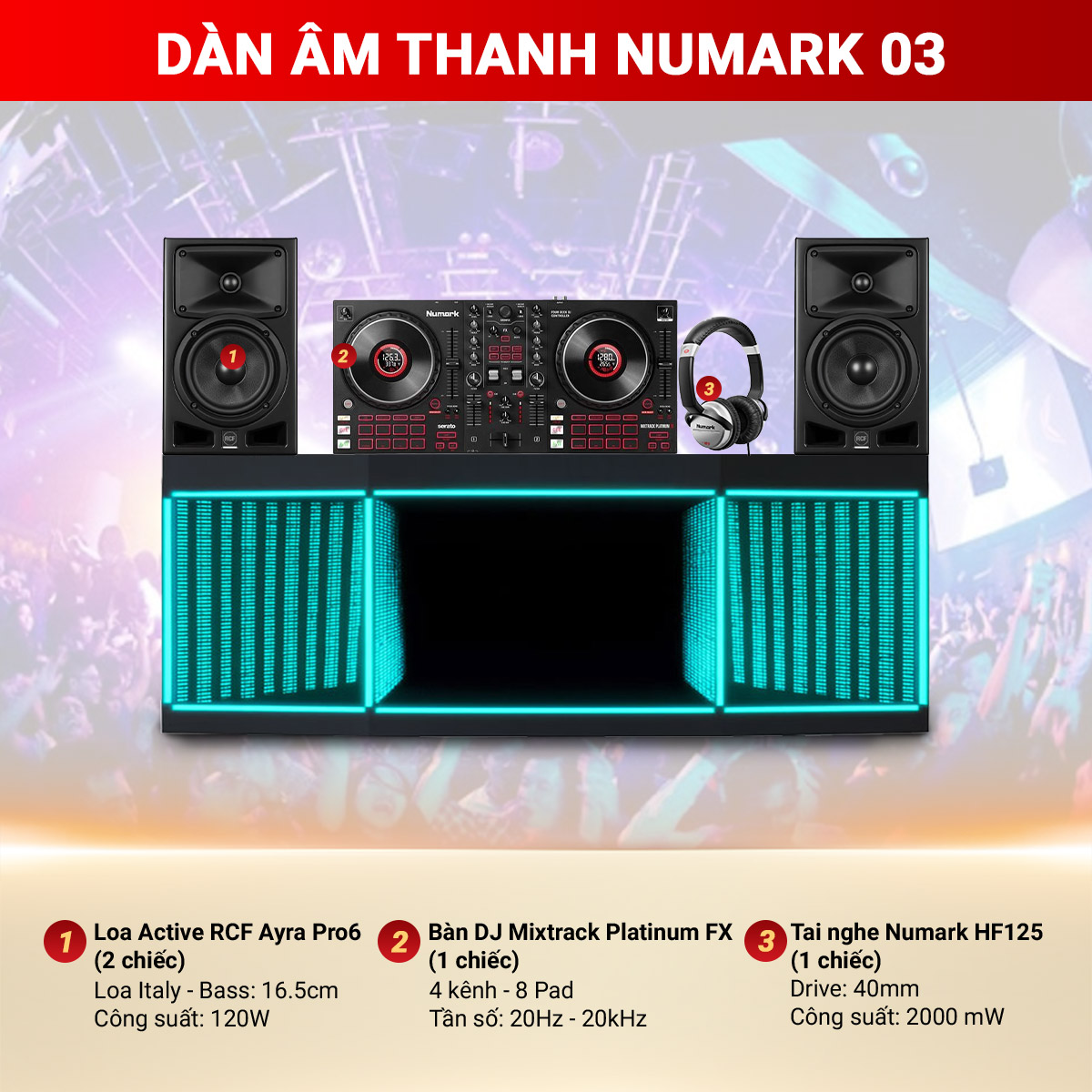 Bạn đang tìm kiếm một bộ dàn âm thanh DJ tại gia vừa chuyên nghiệp, vừa dễ sử dụng? Dàn âm thanh Numark 03 chính là lựa chọn lý tưởng dành cho bạn. Với loa Active RCF AYRA PRO6 mạnh mẽ, bàn DJ Mixtrack Platinum FX hiện đại và tai nghe Numark HF125 chất lượng, bộ combo này mang đến trải nghiệm âm thanh sống động, mượt mà và hoàn hảo cho luyện tập DJ, livestream, hoặc đơn giản là tận hưởng âm nhạc đỉnh cao ngay tại nhà.