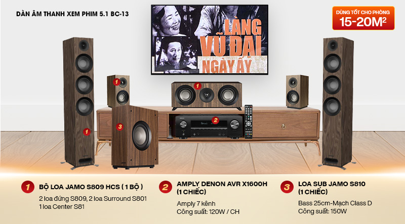 Bộ loa 5.0 Jamo S809 HCS trong dàn âm thanh xem phim 5.1 BC-13 bao gồm các thiết bị: Loa Jamo S809 (1 đôi); Loa Jamo S81 (1 chiếc); Loa Jamo S801(1 đôi)
