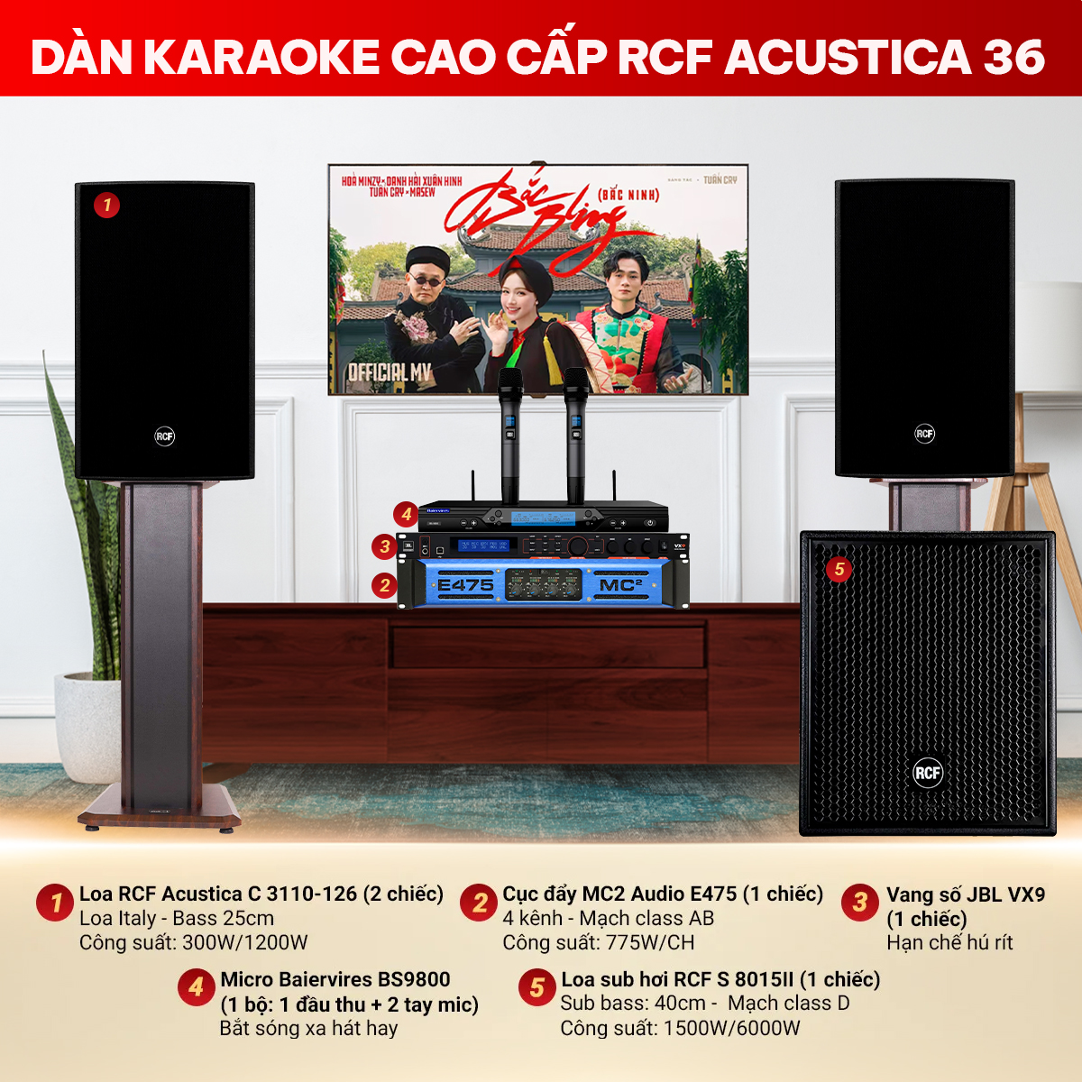 Cấu hình các thiết bị trong Dàn karaoke cao cấp RCF Acustica 36 gồm: