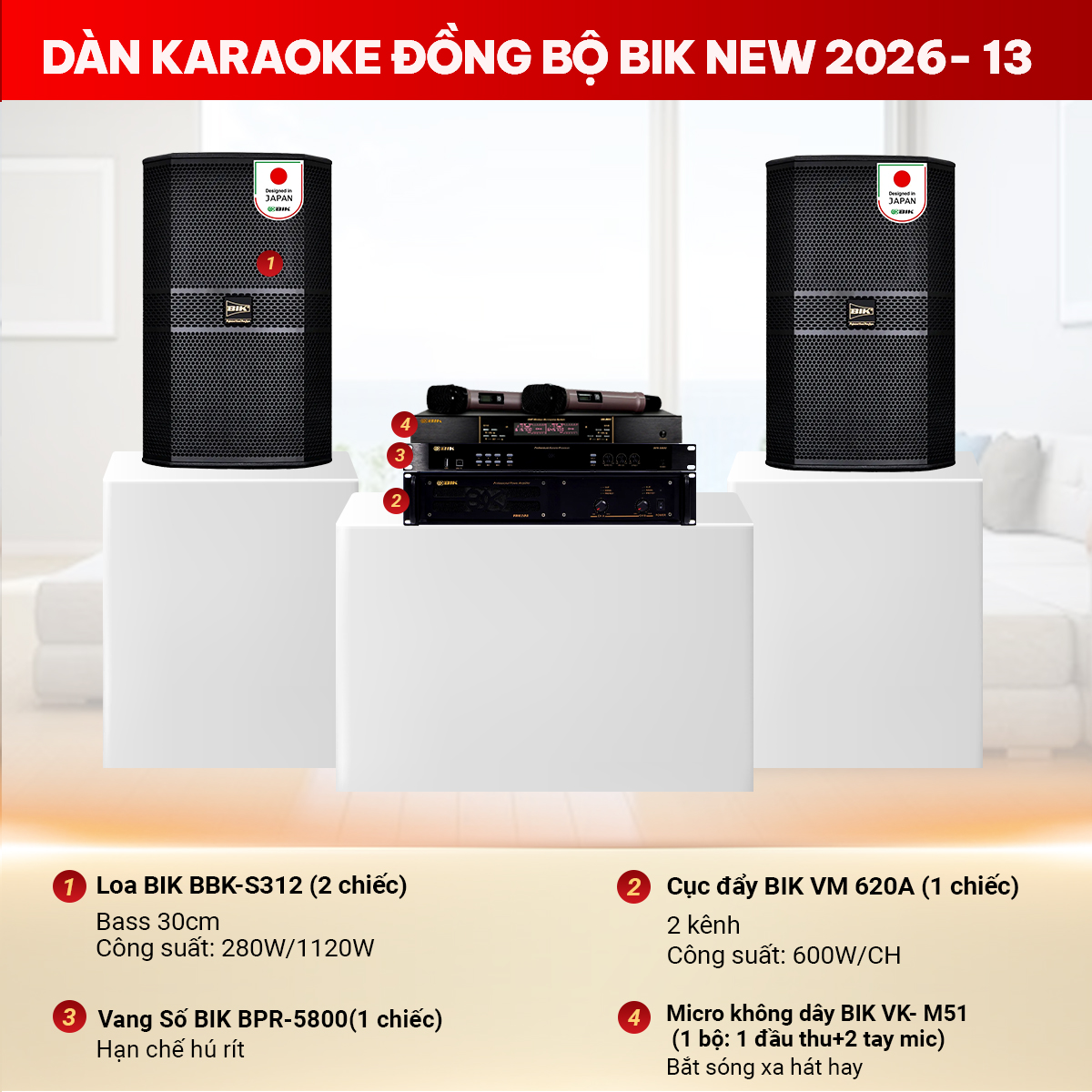Dàn karaoke đồng bộ BIK New 2026-13 là cấu hình mới nhất năm 2026 đến từ thương hiệu âm thanh Nhật Bản BIK, được phối ghép đồng bộ từ loa, cục đẩy, vang số đến micro không dây. Hệ thống mang đến chất âm mạnh mẽ, hát nhẹ tiếng và chống hú hiệu quả, phù hợp cho phòng karaoke gia đình cao cấp, phòng hát kinh doanh, quán giải trí có diện tích vừa và lớn.
