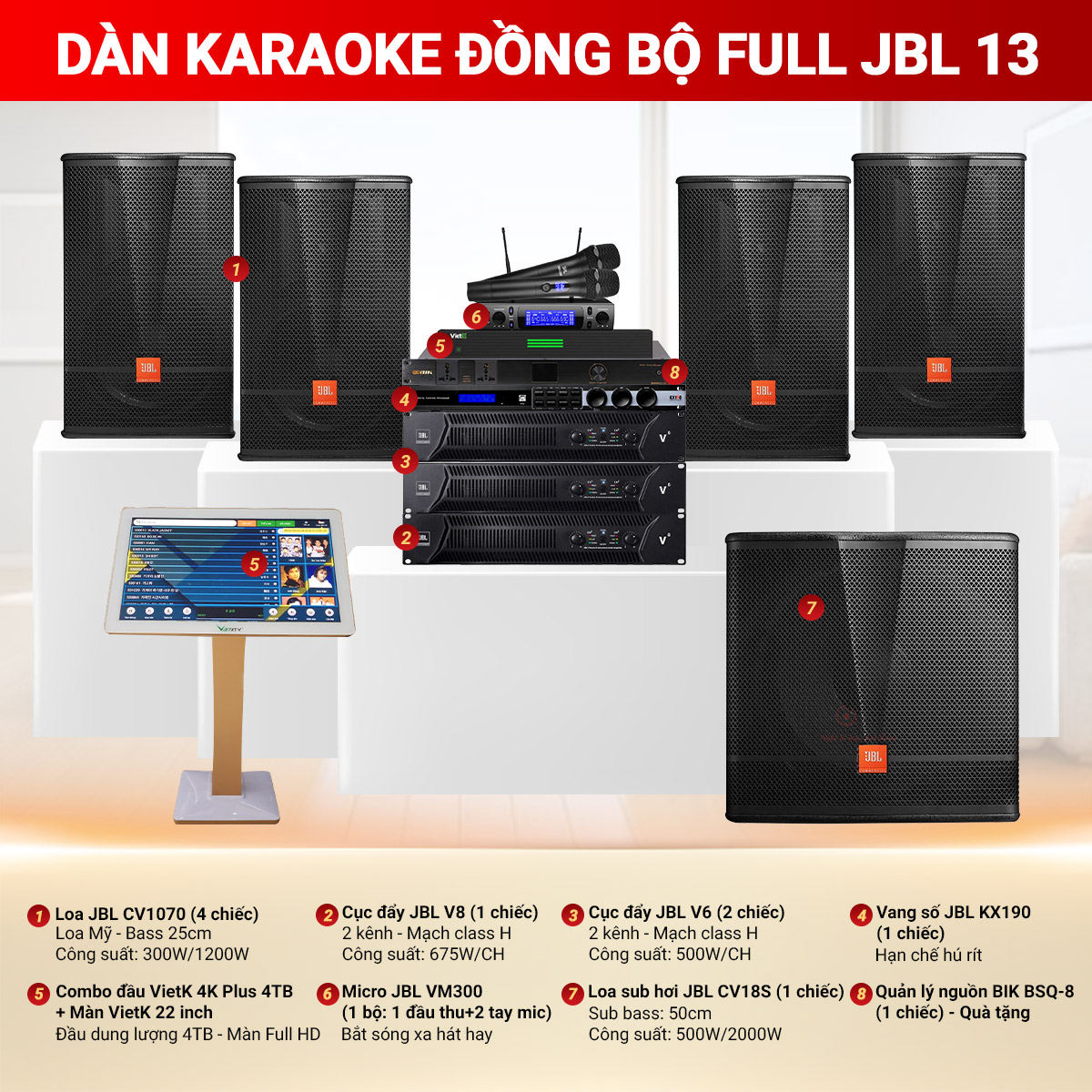 Cấu hình Dàn karaoke đồng bộ full JBL 13 gồm các thiết bị: