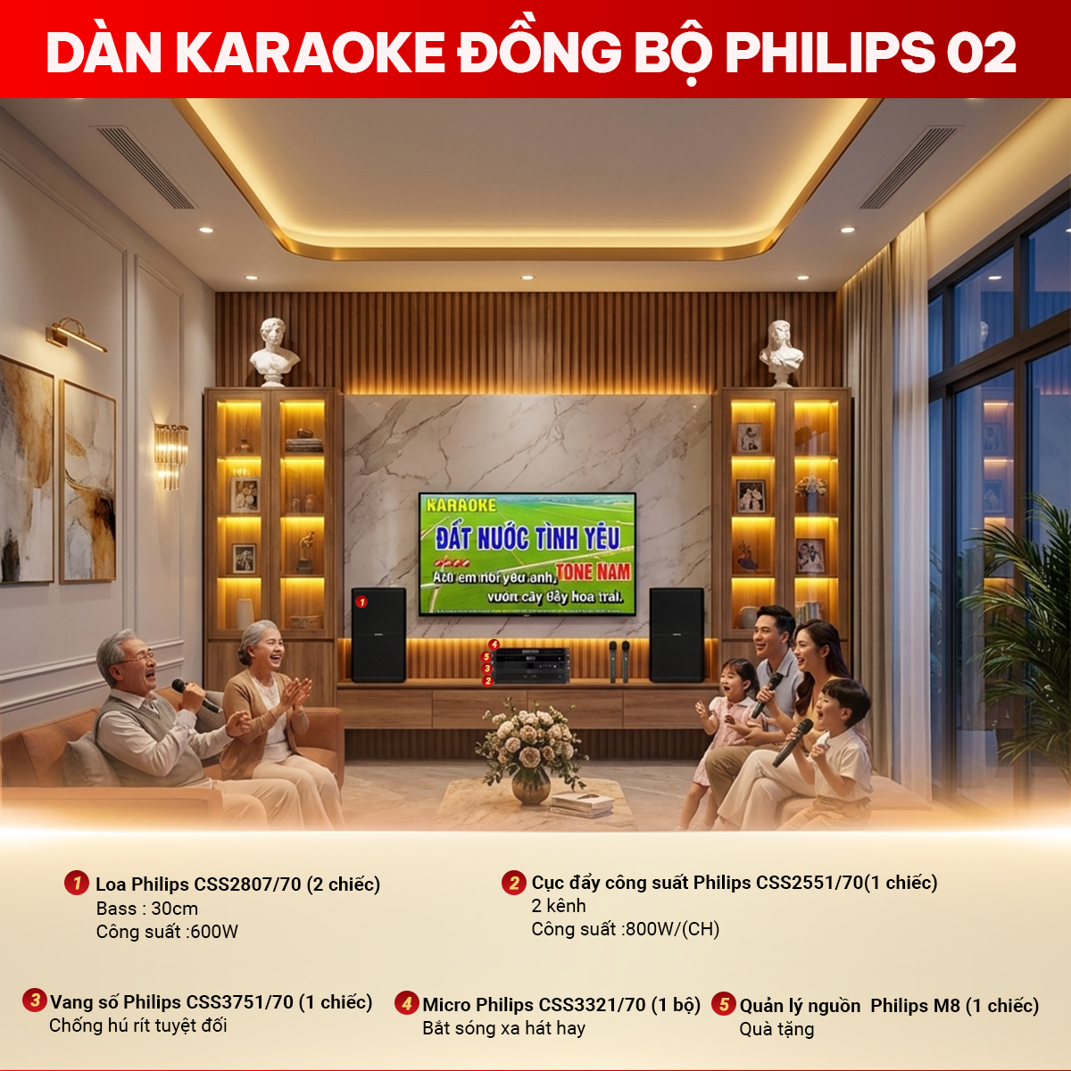 Dàn karaoke đồng bộ Philips 02 là hệ thống âm thanh được phối ghép từ các thiết bị Philips chính hãng, mang đến trải nghiệm karaoke chuyên nghiệp ngay tại nhà. Bộ dàn gồm loa karaoke, cục đẩy công suất, vang số, micro không dây và quản lý nguồn - tất cả được thiết kế để hoạt động đồng bộ, tối ưu chất lượng âm thanh và độ ổn định của hệ thống. Với cấu hình mạnh mẽ, dàn karaoke Philips 02 mang lại âm thanh sống động, bass chắc, treble sáng và giọng hát rõ ràng. Bộ dàn đặc biệt phù hợp với phòng karaoke gia đình cao cấp, phòng giải trí diện tích từ 20 - 40m² hoặc các phòng karaoke kinh doanh quy mô nhỏ.