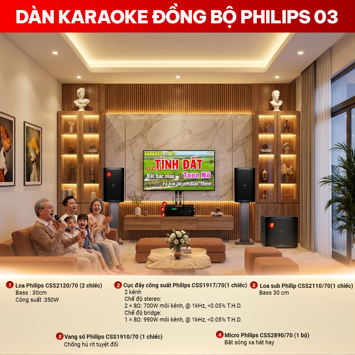 Trong những năm gần đây, xu hướng lựa chọn dàn karaoke đồng bộ thương hiệu lớn đang ngày càng phổ biến. Không chỉ mang lại sự ổn định khi phối ghép, các hệ thống đồng bộ còn giúp âm thanh đạt độ cân bằng và tối ưu hiệu suất vận hành. Dàn karaoke đồng bộ Philips 03 là một trong những cấu hình được nhiều người lựa chọn cho phòng karaoke gia đình cao cấp, phòng giải trí, quán café acoustic hay phòng karaoke kinh doanh quy mô nhỏ. Hệ thống gồm 5 thiết bị chính: loa karaoke, vang số, cục đẩy công suất, micro không dây và loa subwoofer – tất cả đều đến từ thương hiệu Philips danh tiếng.
