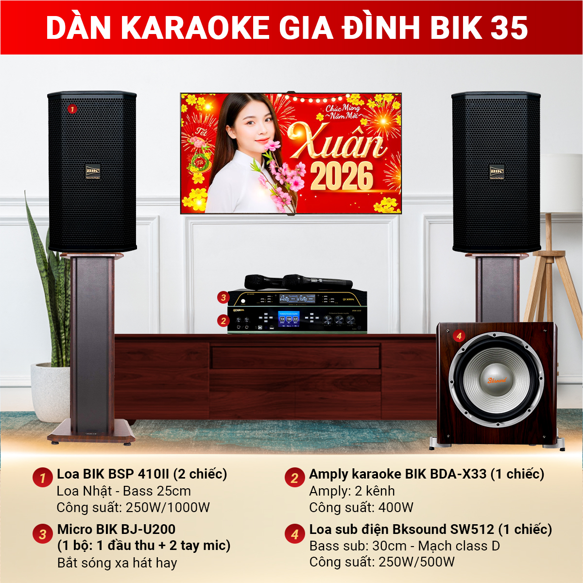 Dàn karaoke gia đình BIK 35 là sự kết hợp giữa các thương hiệu đình đám như BIK, BKSound, BCE mang đến chất âm ấn tượng, giảm thiểu tối đa các hiện tượng rè âm, hú rít giúp người dùng có những phút giây giải trí thoải mái, thú vị sau mỗi giờ làm căng thẳng.