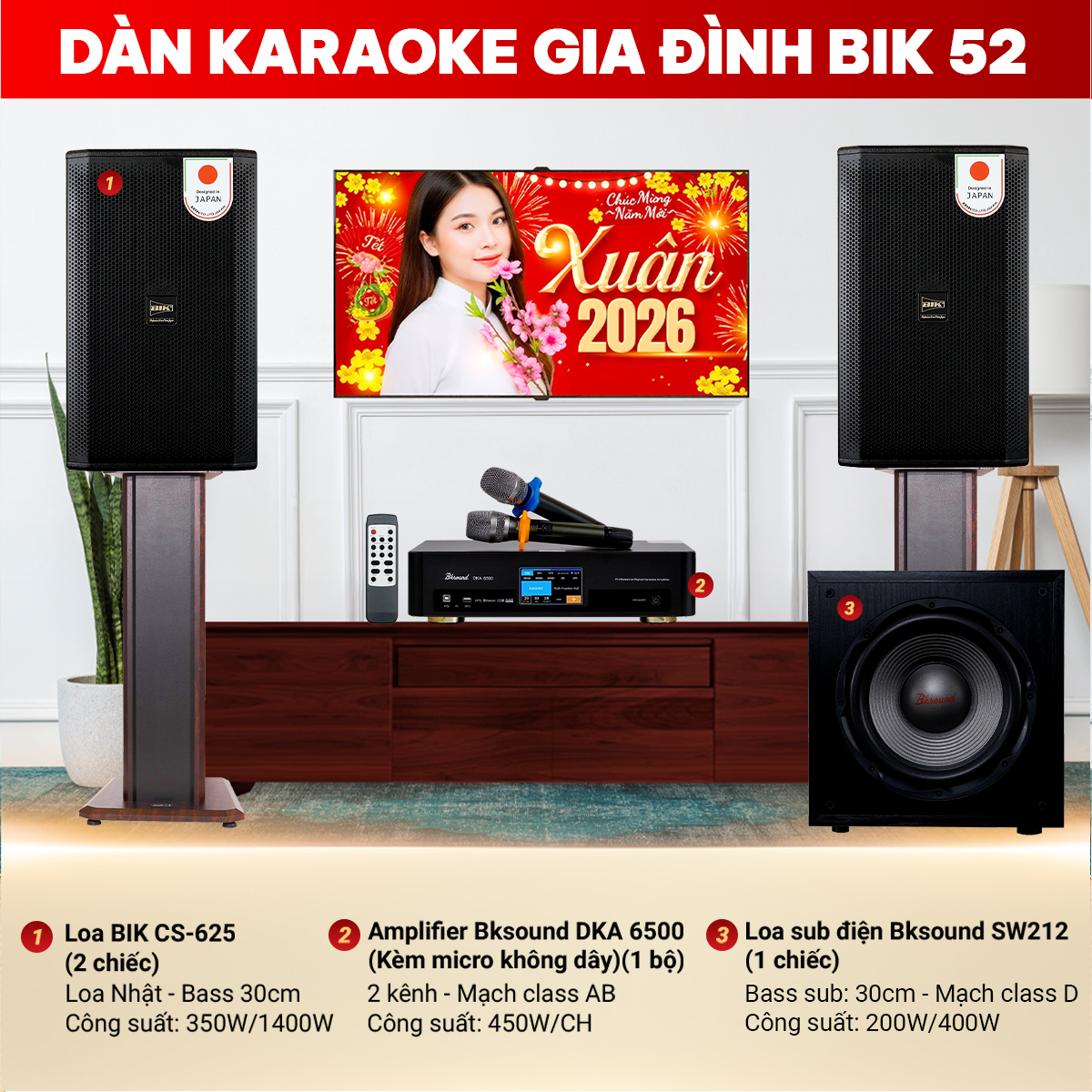 Dàn karaoke gia đình BIK 52 mang đến trải nghiệm giải trí nâng tầm chất lượng mọi hệ thống âm thanh nhờ sự phối ghép hoàn hảo từ các thiết bị của thương hiệu BIK Nhật Bản. Cấu hình được nghiên cứu và kiểm tra nghiêm ngặt về tính năng cho chất âm sống động.