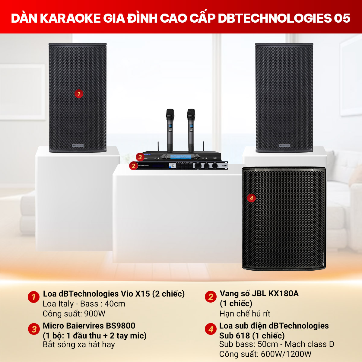 Dàn karaoke gia đình cao cấp dBTechnologies 05 là bộ dàn karaoke cao cấp kết hợp hoàn hảo giữa thiết bị chuyên nghiệp và tính linh hoạt trong không gian gia đình. Bộ dàn sở hữu hệ thống loa full active cao cấp từ thương hiệu dBTechnologies (Italy), vang số hàng đầu từ JBL (USA) và micro không dây hiện đại Baiervires BS-9800, mang đến trải nghiệm âm thanh sống động, chuẩn mực phòng thu ngay tại nhà.