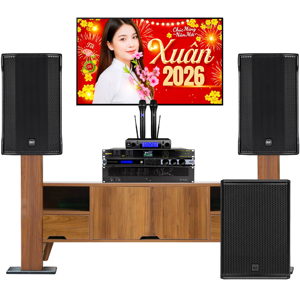 Dàn karaoke gia đình cao cấp RCF 10 là cấu hình âm thanh cao cấp được phối ghép từ những thương hiệu hàng đầu như RCF (Italy) và JBL (Mỹ), hướng đến người dùng yêu cầu chất âm mạnh mẽ, chi tiết, hát nhẹ ít hú và bass sâu uy lực. Với hệ thống loa full bass 30cm kết hợp sub hơi bass 40cm công suất lớn, bộ dàn đáp ứng hoàn hảo nhu cầu hát karaoke, nghe nhạc và giải trí cao cấp trong không gian phòng khách, phòng giải trí sang trọng hoặc phòng karaoke gia đình chuyên nghiệp.