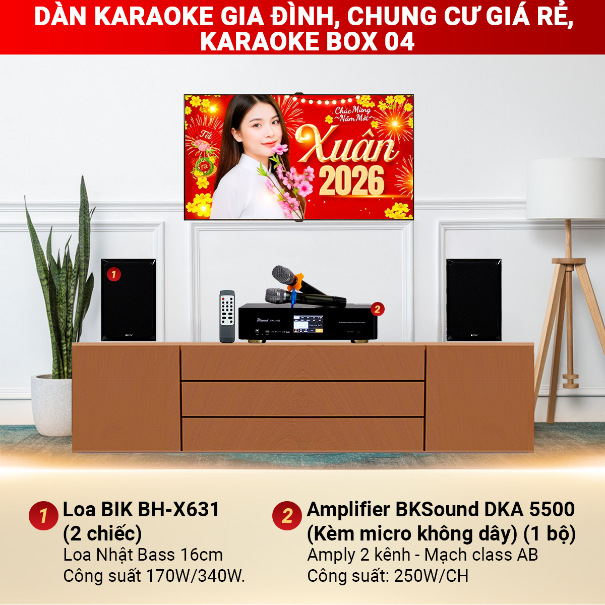 Dàn karaoke gia đình, Chung Cư Giá Rẻ, Karaoke Box 04 là sự lựa chọn hoàn hảo cho những không gian giải trí gia đình, chung cư diện tích nhỏ mà vẫn đảm bảo âm thanh trung thực, hiệu suất mạnh mẽ. Các thiết bị phối ghép từ thương hiệu BIK, BKSound uy tín đáp ứng trọn vẹn nhu cầu giải trí của người dùng.