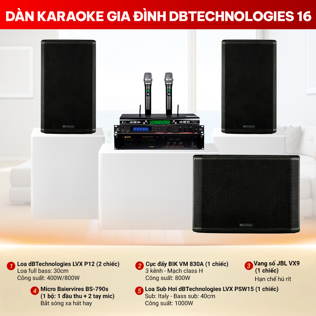 Nếu bạn đang tìm kiếm một hệ thống karaoke chất lượng cao, dàn karaoke gia đình dBTechnologies 16 là lựa chọn lý tưởng để biến ngôi nhà thành phòng hát chuyên nghiệp. Sản phẩm nổi bật với âm thanh mạnh mẽ, trung thực và sống động, phù hợp với mọi thể loại nhạc. Thiết kế gọn gàng, hiện đại, kết hợp với tính năng điều chỉnh linh hoạt giúp người dùng dễ dàng tùy chỉnh âm thanh theo sở thích.