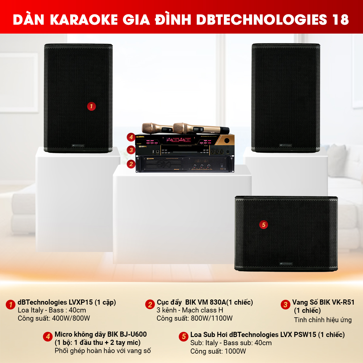 Cấu hình thiết bị Dàn karaoke gia đình dBTechnologies 18 gồm:
