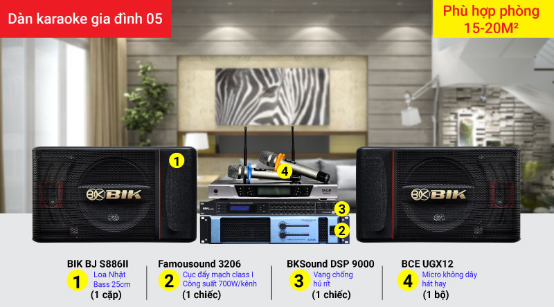 Một bộ dàn được phối ghép từ những thiết bị chất lượng có mức giá tầm trung được phối ghép từ những thương hiệu hàng đầu trên thị trường như : BIK, SAE, BKSound, BCE. Bộ dàn karaoke gia đình 05 mang đến tổng thể hoàn hảo cho không gian của bạn, ấn tượng từ thiết kế hiện đại đến âm thanh chất lượng. Bộ dàn là lựa chọn hoàn toàn phù hợp cho những không gian diện tích từ 15 – 30 m2.