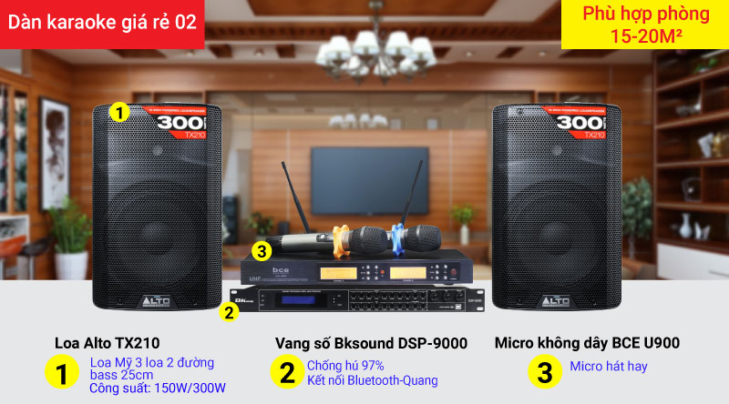 Là sự phối ghép với đầy đủ của các thiết bị hiện đại từ loa karaoke, vang số đến micro không dây chính hãng từ các thương hiệu uy tín Alto, BKSound, BCE. Dàn karaoke giá rẻ 02 là sự lựa chọn lý tưởng đáp ứng nhu cầu giải trí chất lượng cao ngay tại không gian gia đình của bạn. Hãy cùng khám phá bộ dàn này cùng Bảo Châu Elec.