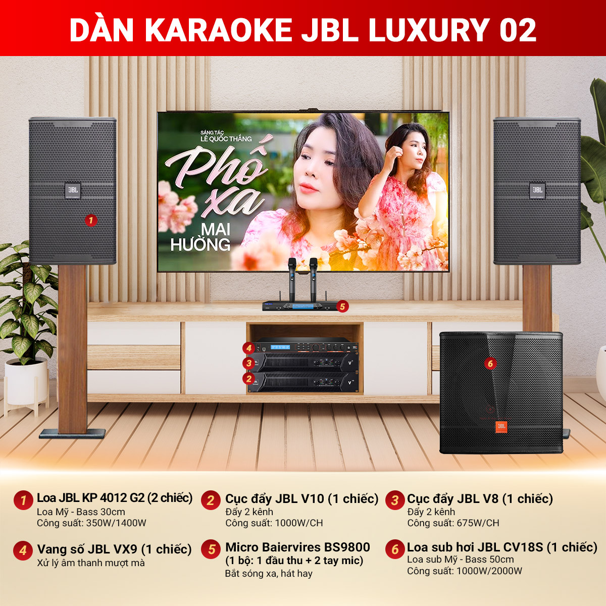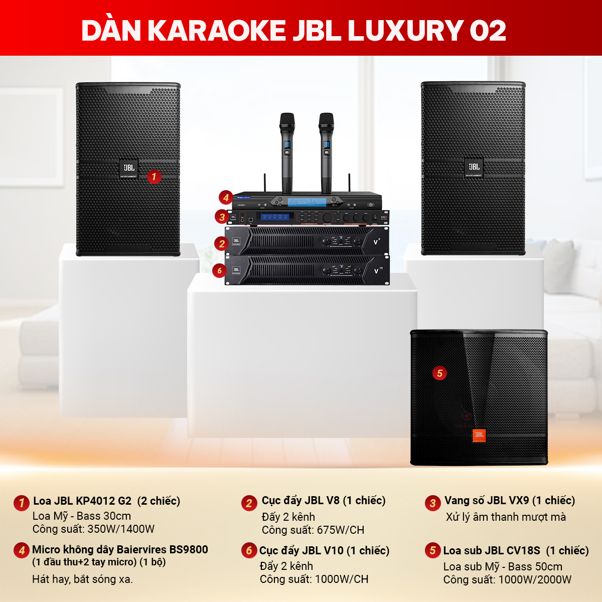 Dàn karaoke JBL Luxury 02 là bộ dàn âm thanh chuyên nghiệp với cấu hình mạnh mẽ, là sự kết hợp từ những thiết bị âm thanh đỉnh cao của các thương hiệu danh tiếng trên thế giới như JBL, Baiervires. Với kiểu dáng bắt mắt và nhiều tính năng vượt trội, bộ karaoke gia đình này tự tin mang đến những trải nghiệm karaoke tuyệt vời cho không gian gia đình của bạn.