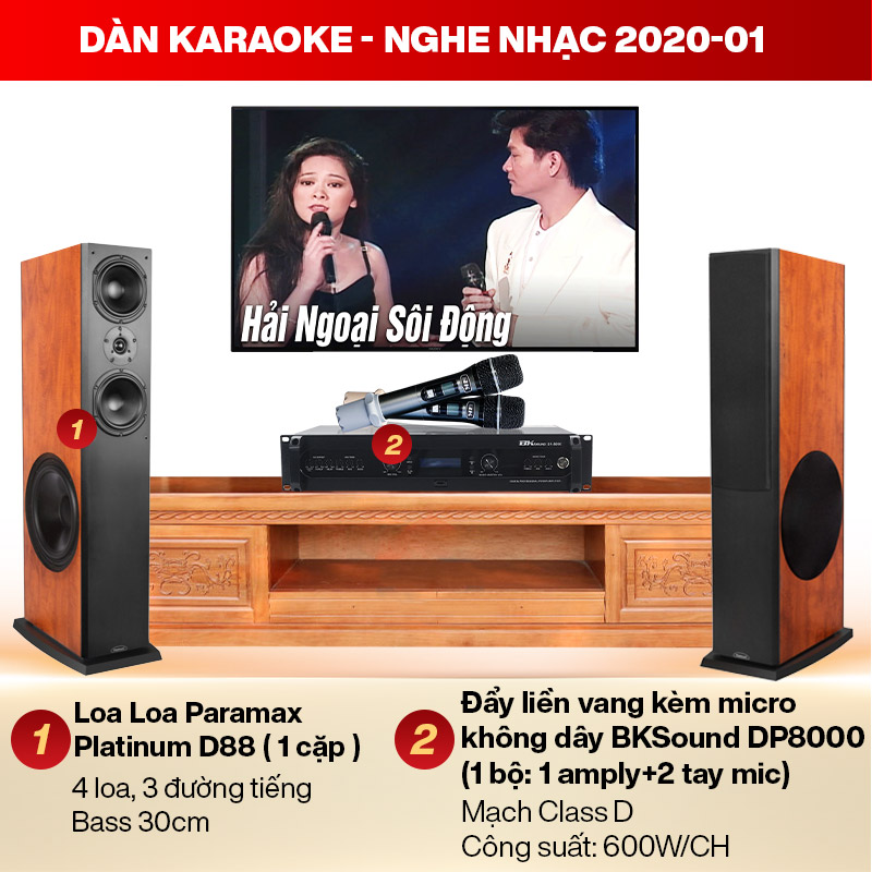 Dàn karaoke - nghe nhạc 2020-01 là bô dàn với sự kết hợp giữa 2 thiết bị hiện đại có cấu hình phù hợp đến từ thương hiệu uy tín Paramax và BKSound. Được đội ngũ kỹ thuật viên phối ghép loa nghe nhạc Paramax Platinum D88 với thiết bị cục đẩy 3 trong 1 cho bạn thoải mái hát karaoke hoặc nghe nhạc với chất lượng âm thanh hoàn hảo.