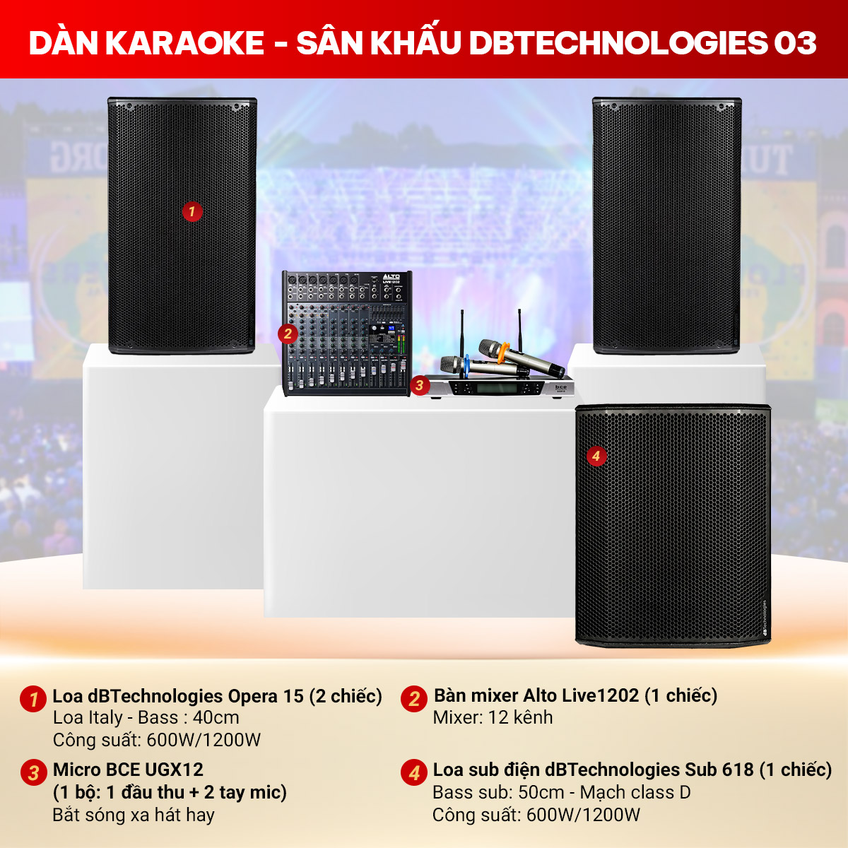 Dàn karaoke – sân khấu dBTechnologies 03 là sự kết hợp hoàn hảo giữa công nghệ âm thanh hiện đại và thiết kế chuyên nghiệp, mang đến trải nghiệm ca hát và biểu diễn đỉnh cao. Với những thiết bị âm thanh chất lượng từ thương hiệu dBTechnologies, bộ dàn không chỉ đáp ứng nhu cầu karaoke gia đình cao cấp mà còn phù hợp cho sân khấu, hội trường hay các sự kiện lớn, đem lại âm thanh sống động, mạnh mẽ và chân thực nhất.