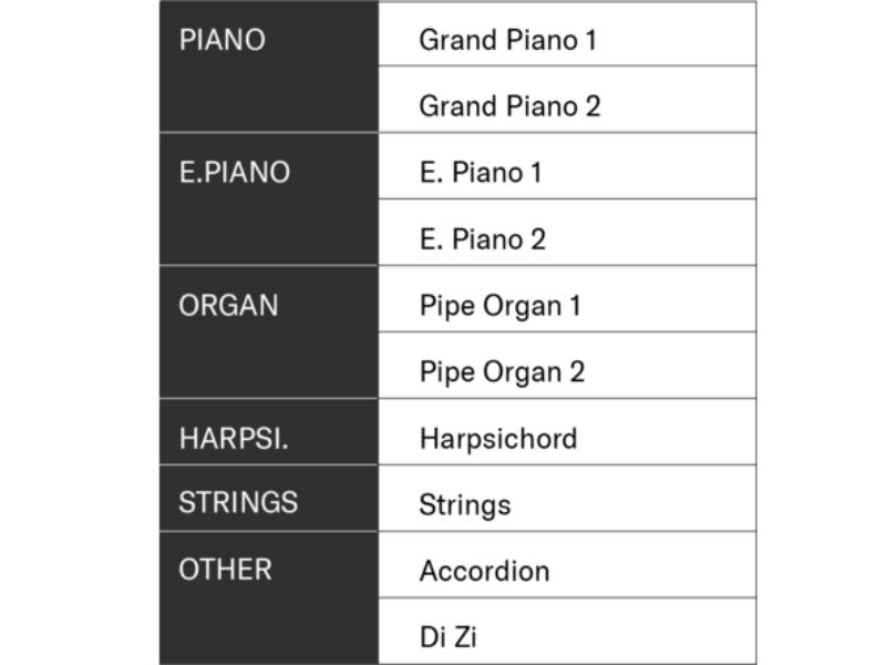 Không chỉ dừng lại ở tiếng đàn piano truyền thống, Yamaha P-145BT còn mang đến kho âm thanh phong phú với 10 voice nhạc cụ tích hợp, đáp ứng đa dạng phong cách chơi. Bên cạnh tiếng Grand Piano chân thực, người dùng có thể khám phá piano điện cổ điển, organ nhà thờ, harpsichord, accordion và Di Zi - mỗi âm sắc đều được Yamaha tái tạo tinh tế, giữ nguyên đặc trưng của nhạc cụ gốc.