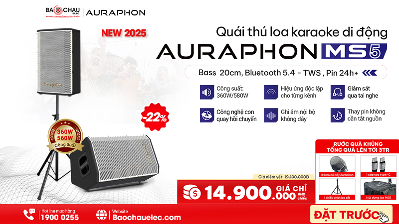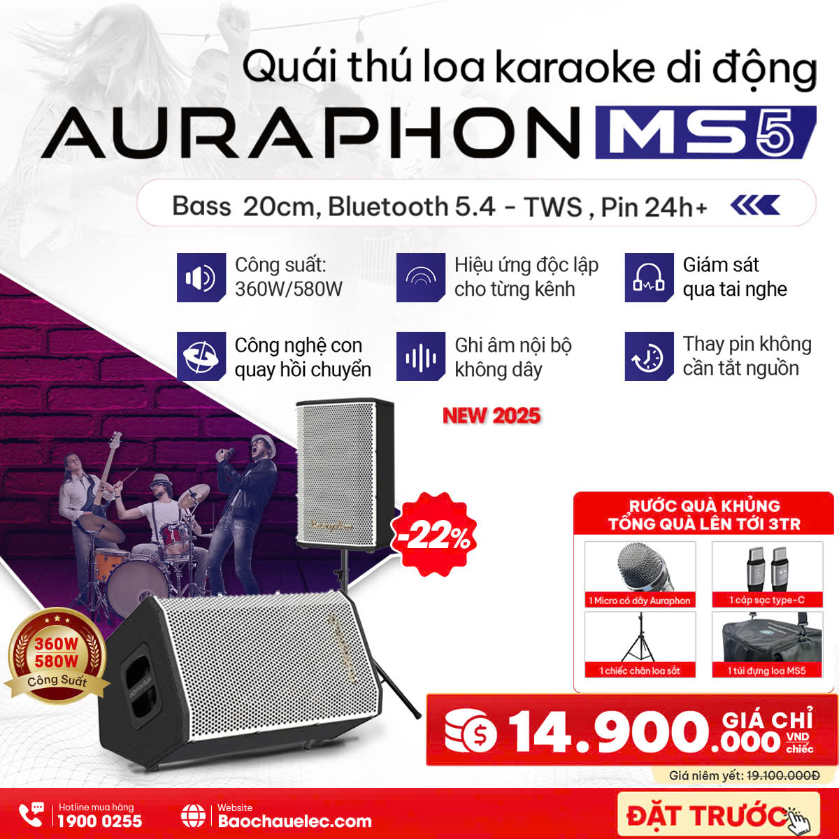 “Quái thú âm thanh di động” loa Auraphon MS5 chính thức mở bán tại Bảo Châu Elec với chương trình đặt mua trước, hứa hẹn khuấy đảo mọi sân khấu đường phố, sự kiện ngoài trời, acoustic cafe cho đến trình diễn nghệ thuật tự do. Không chỉ sở hữu sức mạnh âm thanh ấn tượng, khả năng khuếch đại mạnh mẽ và độ bền vượt chuẩn di động, Auraphon MS5 đang trở thành lựa chọn đáng giá cho người chơi nhạc, ban nhạc biểu diễn, team truyền thông sự kiện hay các creator đam mê sáng tạo nội dung.