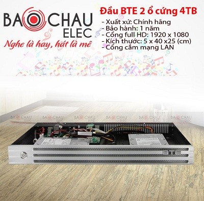 Đầu karaoke BTE 2 ổ cứng 4TB là dòng đầu karaoke phiên bản nâng cấp từ đầu karaoke BTE 2 ổ cứng 3TB với dung lượng được tăng lên tối đa 8TB (Tính tới thời điểm hiện tại, Bởi ổ cứng lớn nhất hiện nay trên thị trường là 4TB). Nhằm đáp ứng nhu cầu người sử dụng ngày cao và đa dạng kể cả về số lượng bài hát lẫn chất lượng hình ảnh, âm thanh bài hát.