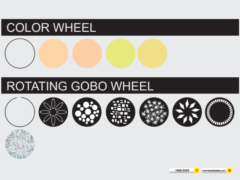 Đèn VLTG TV-FE500P được trang bị 1 bánh xe gobo quay gồm 7 gobo có thể thay thế + Open, cho phép tạo ra nhiều hình ảnh ánh sáng khác nhau, từ họa tiết cơ bản đến hiệu ứng chuyển động phức tạp. Hệ thống gobo quay hoạt động mượt mà, chính xác, giúp các hiệu ứng ánh sáng trở nên sống động và có chiều sâu hơn trên sân khấu.