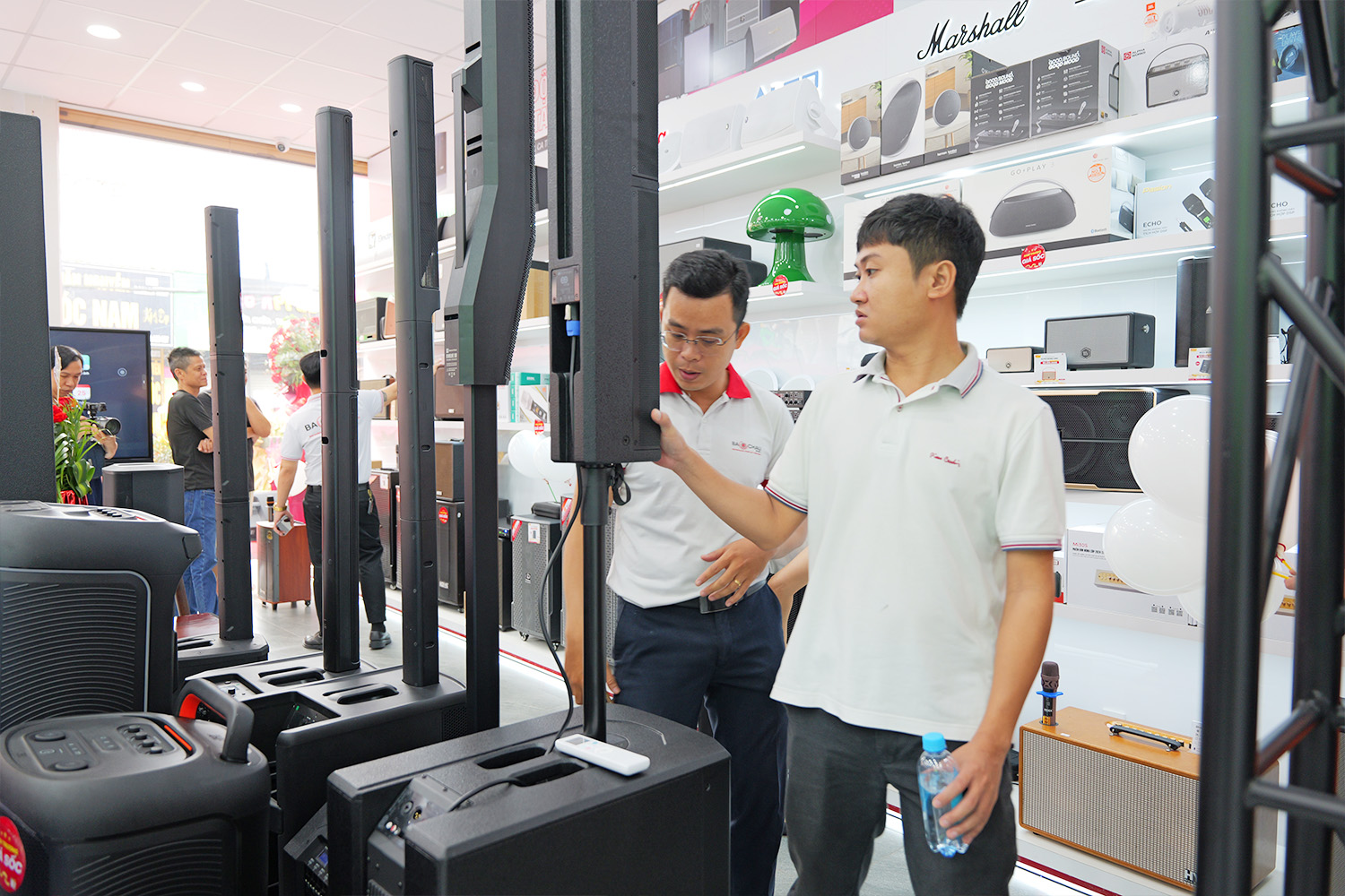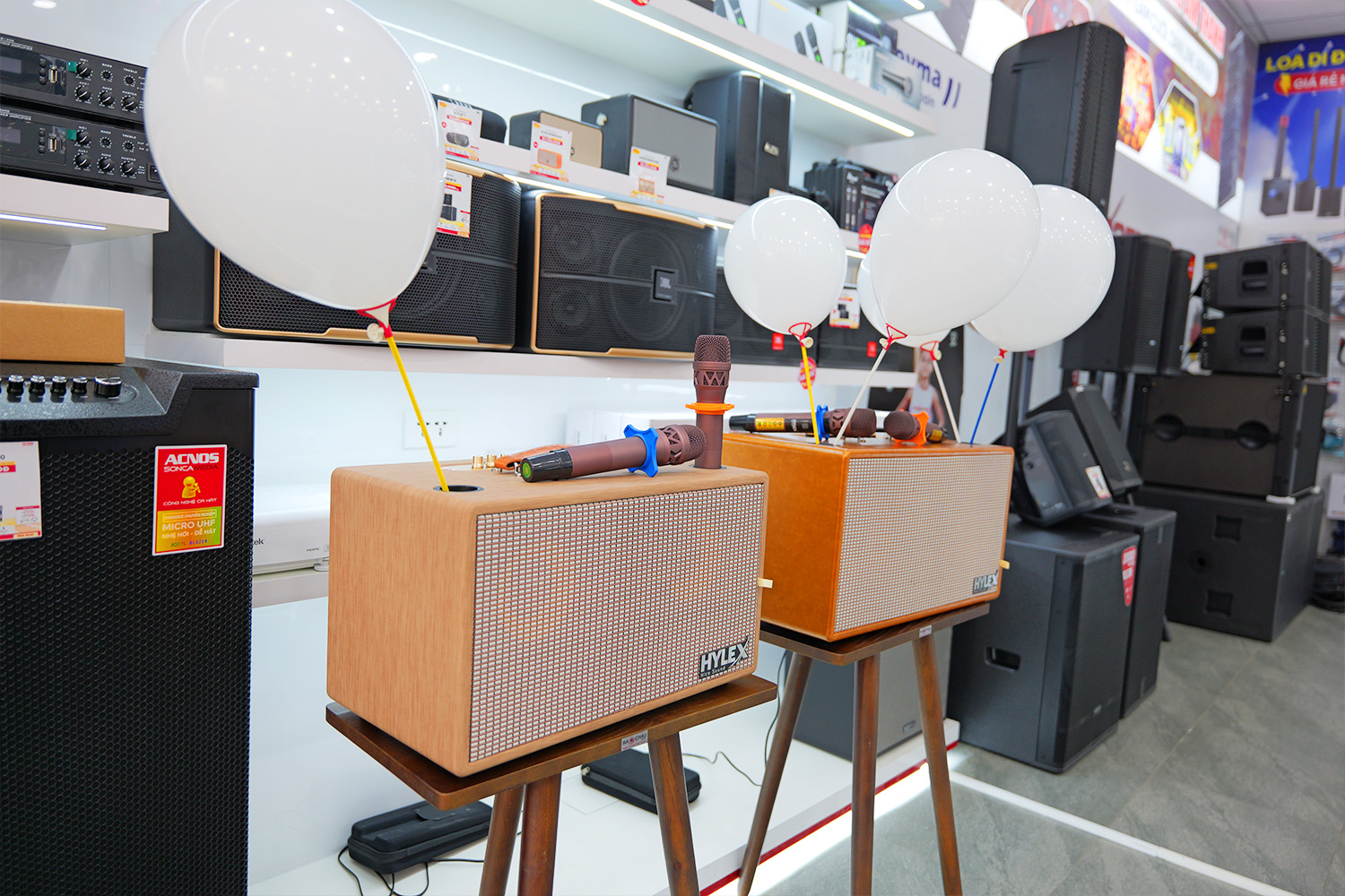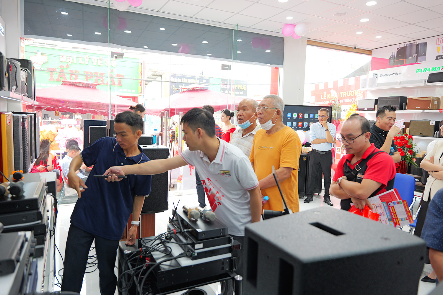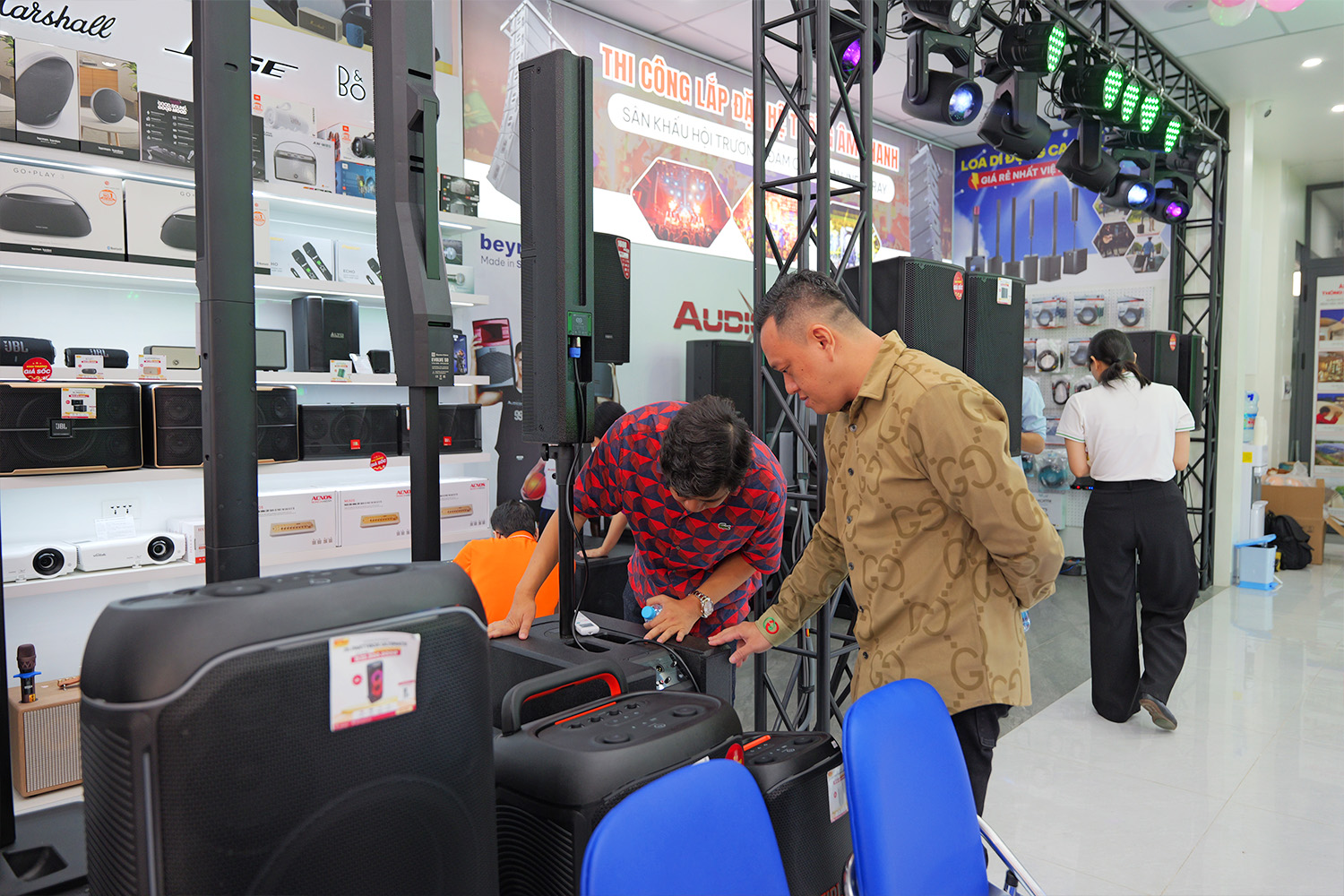 Phòng nghe thử được đầu tư cách âm tốt, trang bị hệ thống demo loa và micro chuyên dụng, mang đến trải nghiệm thực tế với chất âm trung thực, độ vọng thấp trong môi trường yên tĩnh. Ngoài ra, showroom còn được trang bị đầy đủ thiết bị phụ trợ như hệ thống ánh sáng demo, amply karaoke, mixer, micro thử cùng hệ thống điện ổn định, đảm bảo cho khách hàng những trải nghiệm tối ưu.