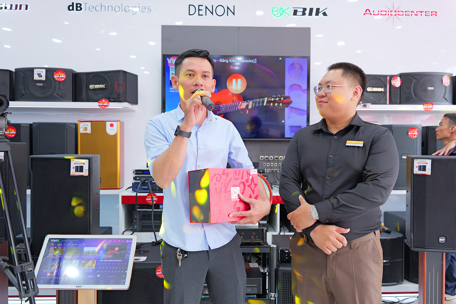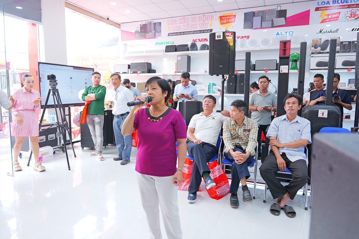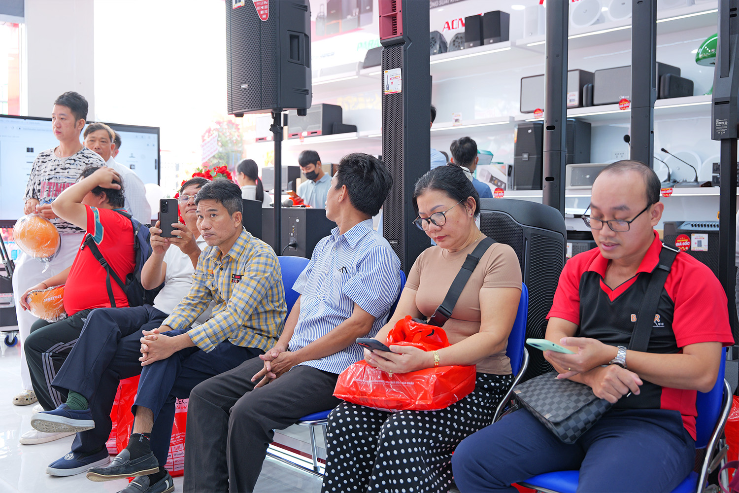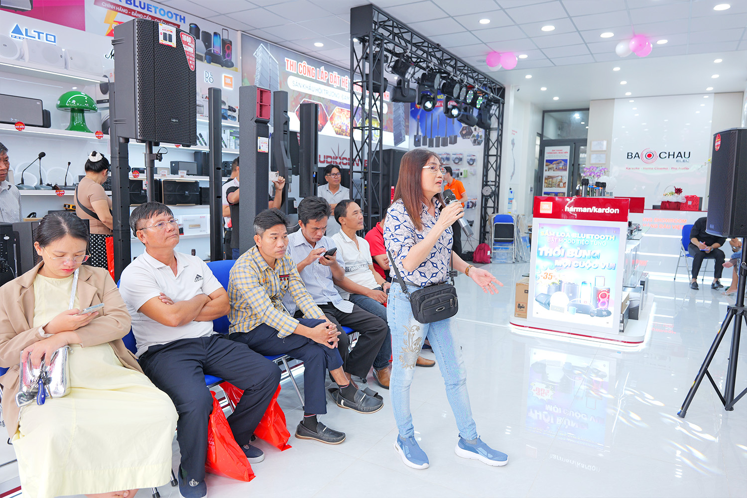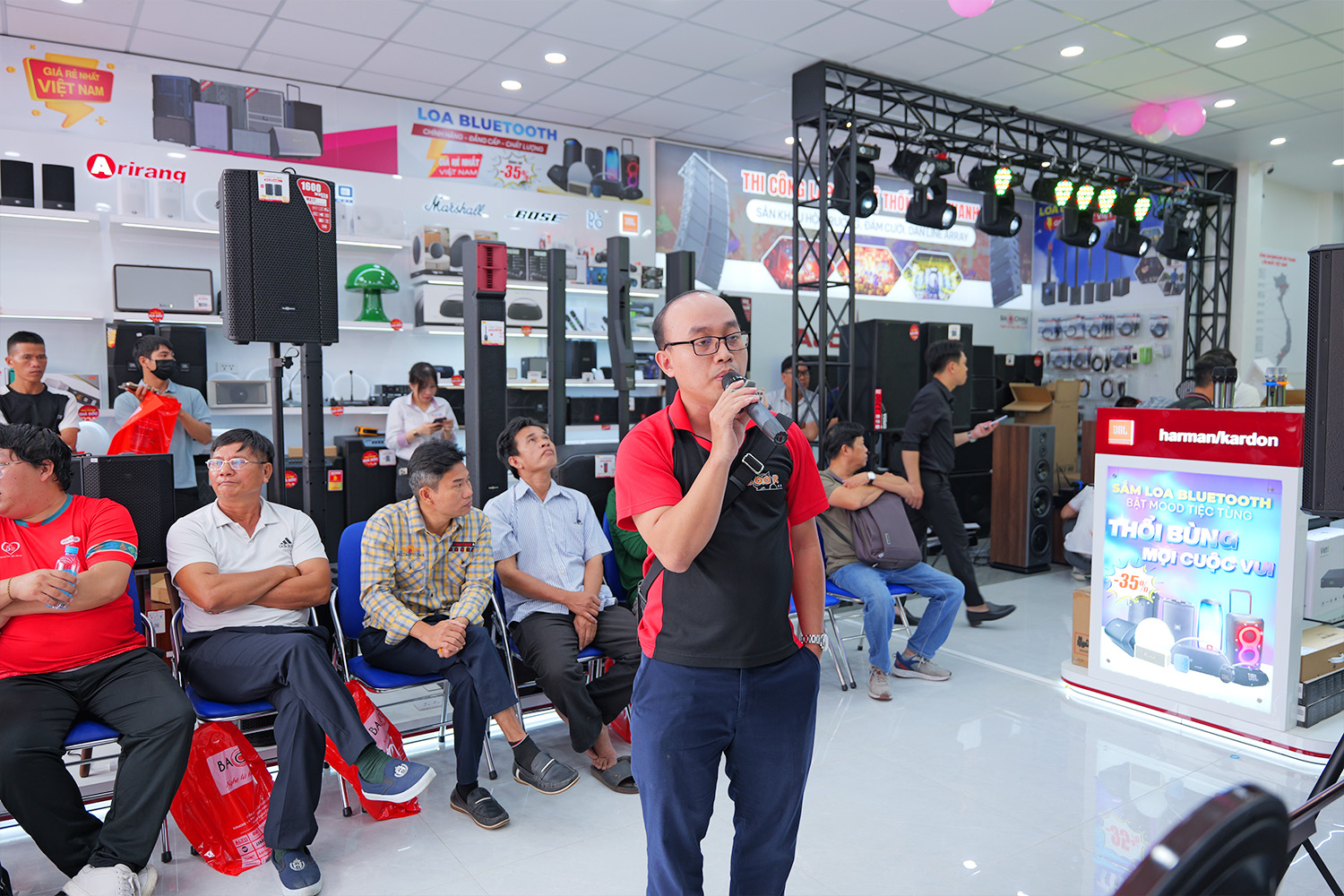 Phòng nghe thử được đầu tư cách âm tốt, trang bị hệ thống demo loa và micro chuyên dụng, mang đến trải nghiệm thực tế với chất âm trung thực, độ vọng thấp trong môi trường yên tĩnh. Ngoài ra, showroom còn được trang bị đầy đủ thiết bị phụ trợ như hệ thống ánh sáng demo, amply karaoke, mixer, micro thử cùng hệ thống điện ổn định, đảm bảo cho khách hàng những trải nghiệm tối ưu.