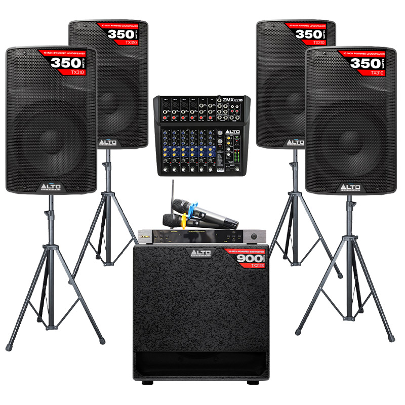 Bộ dàn sử dụng 2 cặp loa Alto TX310 được trang bị hệ thống trình điều khiển cao cấp và có thiết kế hai đường tiếng với hai loa bao gồm một loa trầm 25 cm với cuộn dây thoại 3,55 cm và một loa tweeter 2,5 cm với màng titan.