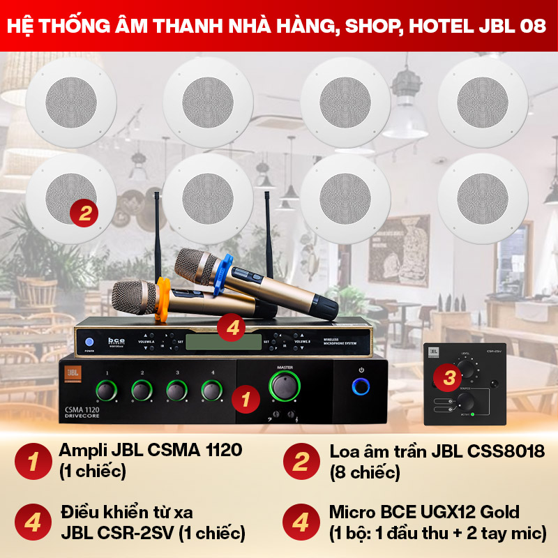 Cấu hình thiết bị hệ thống âm thanh nhạc nền hotel, nhà hàng, cafe JBL 08 gồm: