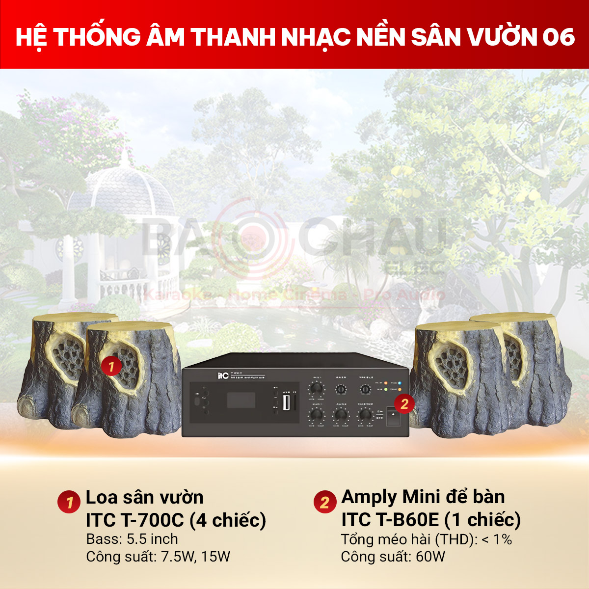 Với thiết kế tinh gọn, dễ lắp đặt và khả năng hoạt động ổn định trong mọi điều kiện thời tiết, hệ thống âm thanh nhạc nền sân vườn 06 là lựa chọn tối ưu cho những không gian ngoài trời cần âm thanh nhẹ nhàng, thư giãn nhưng vẫn đảm bảo tính thẩm mỹ và hiệu suất. Sự kết hợp giữa loa sân vườn ITC T-700C bền bỉ và amply mini để bàn ITC T-B60E hiện đại mang đến giải pháp âm thanh tiện lợi, tiết kiệm chi phí mà vẫn đầy đủ tính năng cần thiết.